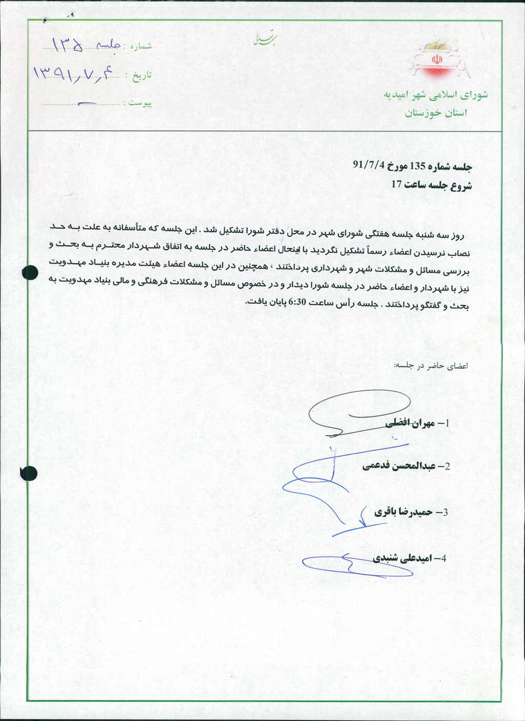 صورتجلسه شماره ۱۳۵ شورای اسلامی شهر امیدیه
