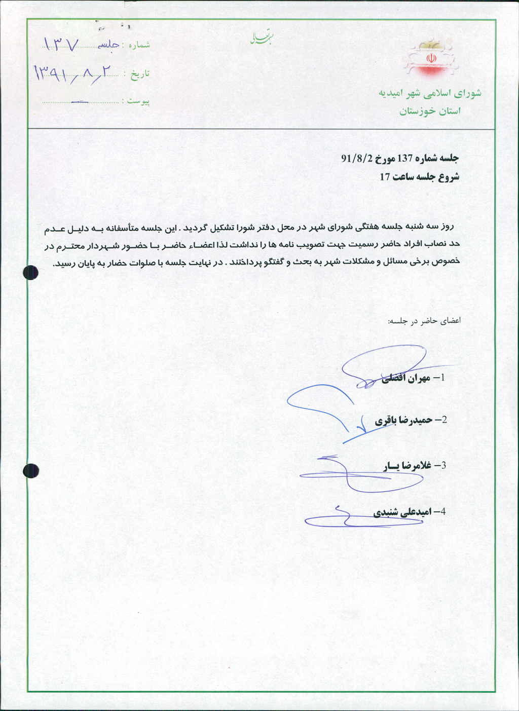 صورتجلسه شماره ۱۳۷ شورای اسلامی شهر امیدیه