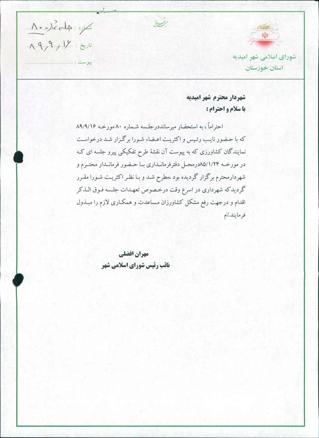 احتراماً ، به استحضار میرسانددرجلسه شماره ۸۰ مورخه ۱۶/۹/۸۹ که با حضور نایب رئیس و اکثریت اعضاء شورا برگزار شد درخواست نمایندگان کشاورزی که به پیوست آن نقشة طرح تفکیکی پیرو جلسه ای که در مورخه ۲۴/۱/۸۵درمحل دفترفرمانداری با حضور فرماندار محترم و شهردارمحترم برگزار گردیده بود ،مطرح شد و با نظر اکثریت شورا مقرر گردیدکه شهرداری در اسرع وقت درخصوص تعهدات جلسه فوق الذکر اقدام و درجهت رفع مشکل کشاورزان مساعدت و همکاری لازم را مبذول فرمایند%م