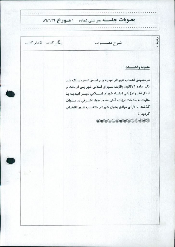 درخصوص انتخاب شهردار اميديه و بر اساس تبصره يك بند يك ماده ۷۱قانون وظايف شـوراي اسلامي شهر پس از بحث و تبادل نظر و ارزيابي اعضـاء شوراي اسـلامي شهـر اميديه با عنايت به خدمات ارزنده آقاي محمد جواد اشرفي در سنوات گذشته با ۷رأي موافق بعنوان شهردار منتخب شورا انتخاب گرديد %