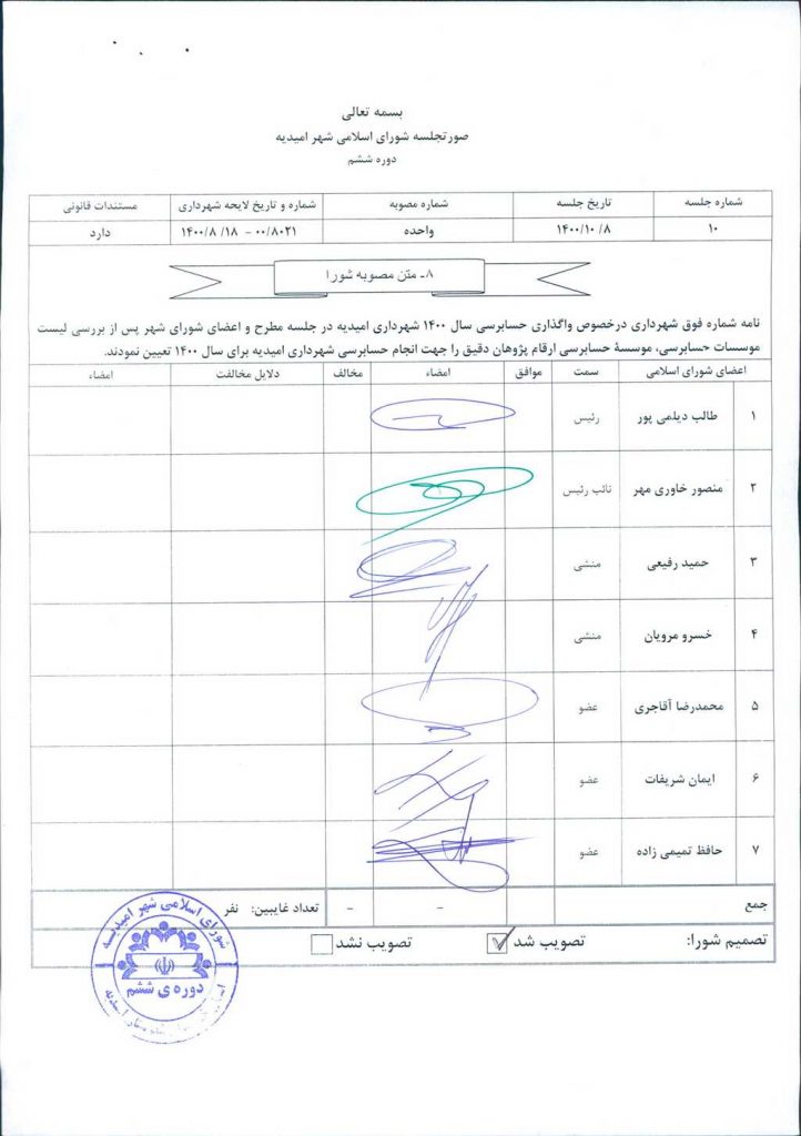 مصوبه شماره ۱ جلسه شماره ۱۰ مورخ ۱۴۰۰/۱۰/۸ شورای اسلامی شهر امیدیه