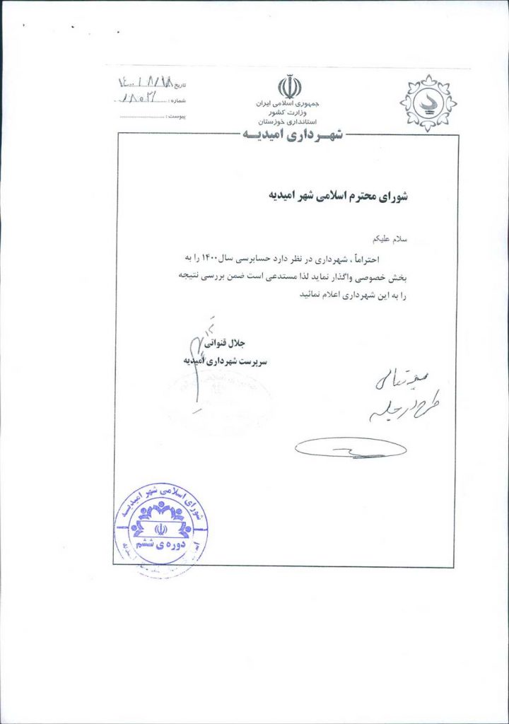 نامه شماره فوق شهرداری در خصوص واگذاری حسابرسی سال ۱۴۰۰ شهرداری امیدیه در جلسه مطرح و اعضای شورای شهر پس از بررسی لیست مؤسسات حسابرسی، مؤسسه حسابرسی ارقام پژوهان دقیق را جهت انجام حسابرسی شهرداری امیدیه برای سال۱۴۰۰ تعیین نمودند.