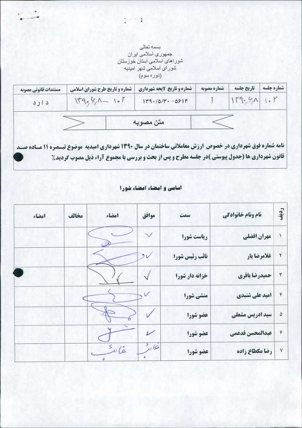 نامه شماره فوق شهرداری در خصوص ارزش معاملاتی ساختمان در سال ۱۳۹۰ شهرداری امیدیه موضوع تبصره ۱۱ ماده صد قانون شهرداری ها (جدول پیوستی )در جلسه مطرح و پس از بحث و بررسی با مجموع آراء ذیل مصوب گردید%