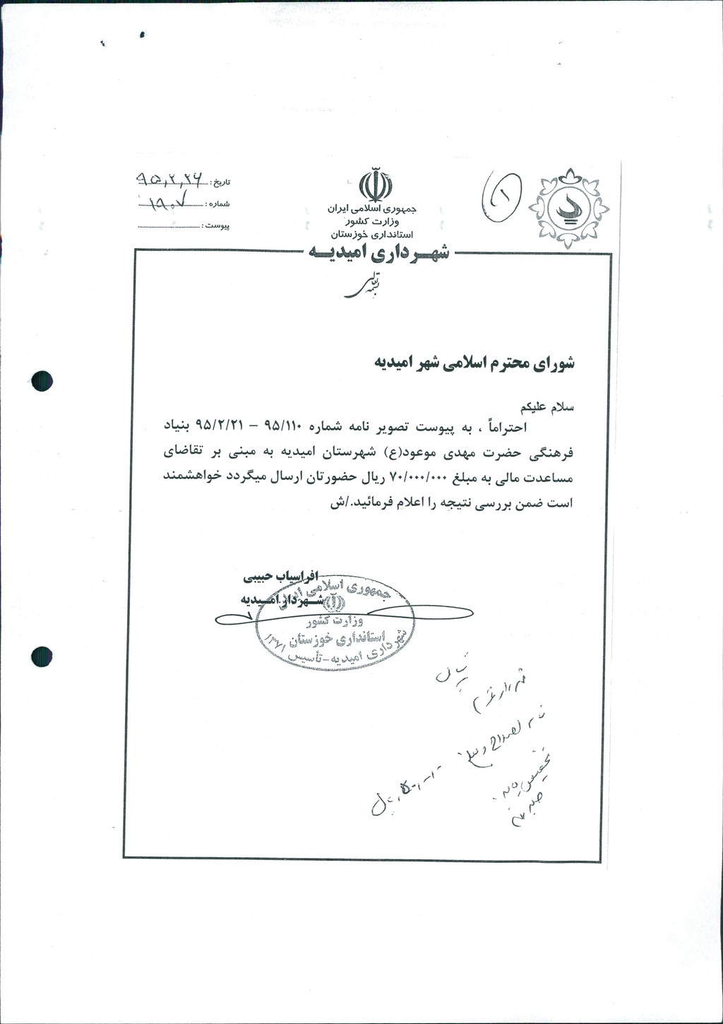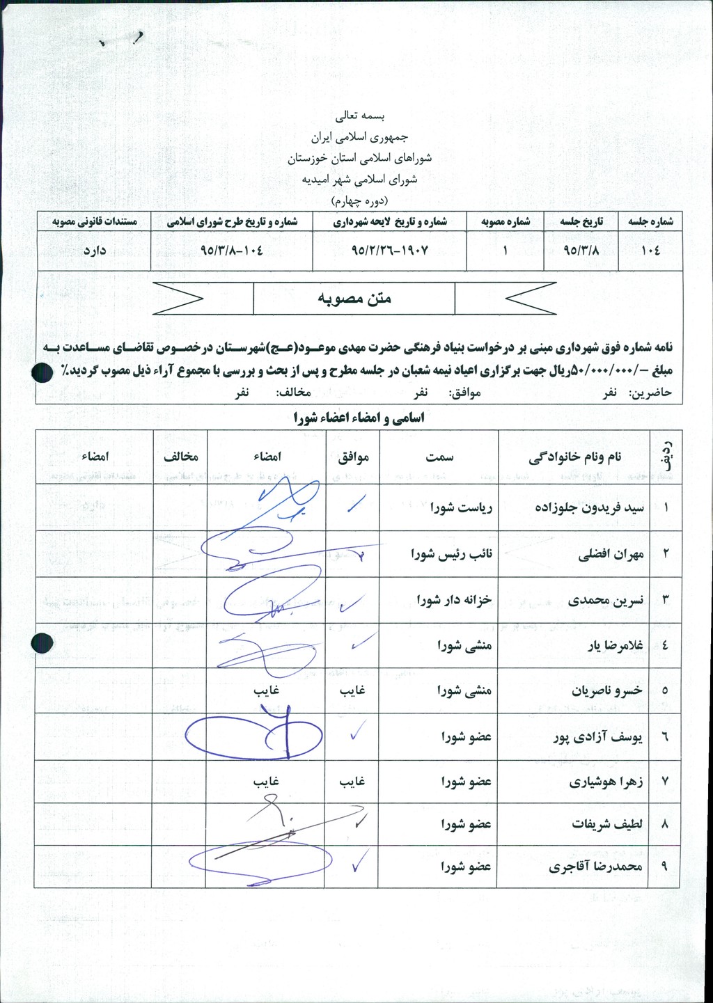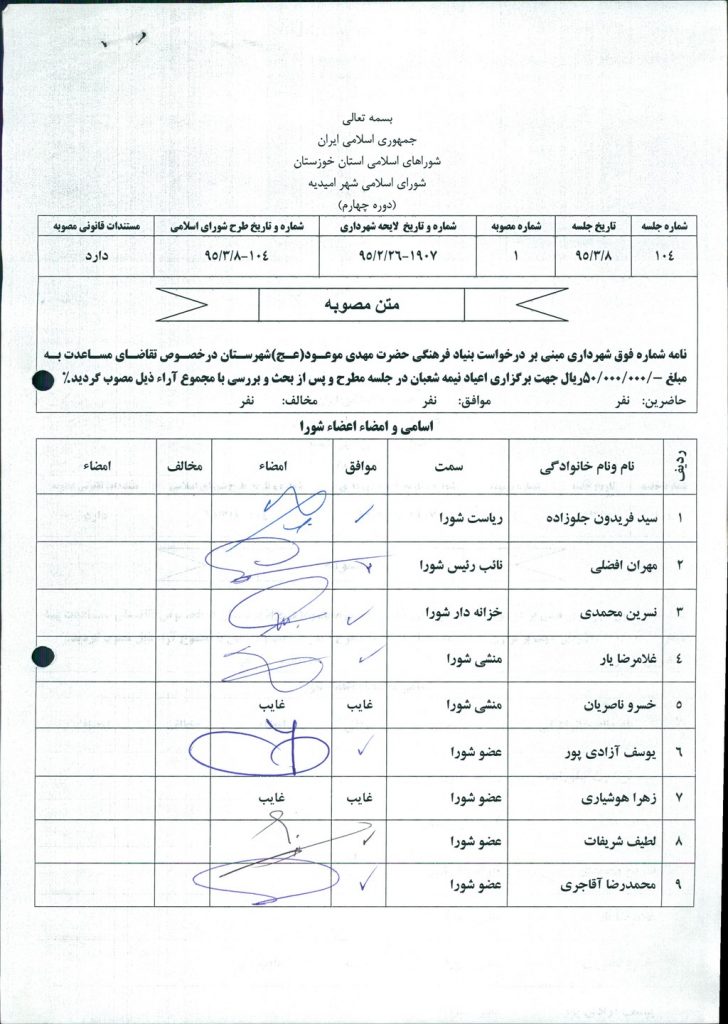 مصوبه شماره ۱ جلسه شماره ۱۰۴ شورای اسلامی شهر امیدیه