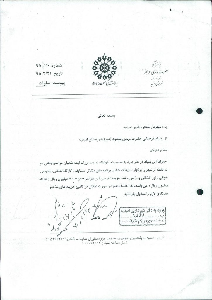 نامه شماره فوق شهرداری مبنی بر درخواست بنیاد فرهنگی حضرت مهدی موعود(عج)شهرستان درخصوص تقاضای مساعدت به مبلغ ۵۰۰۰۰۰۰۰ريال جهت برگزاری اعیاد نیمه شعبان در جلسه مطرح و پس از بحث و بررسی با مجموع آراء ذیل مصوب گردید%