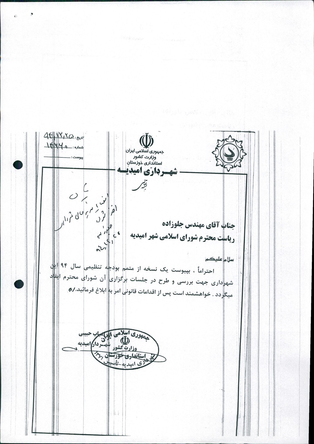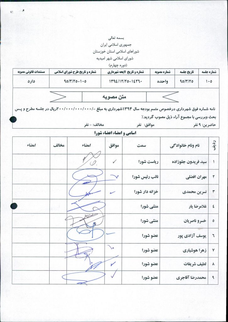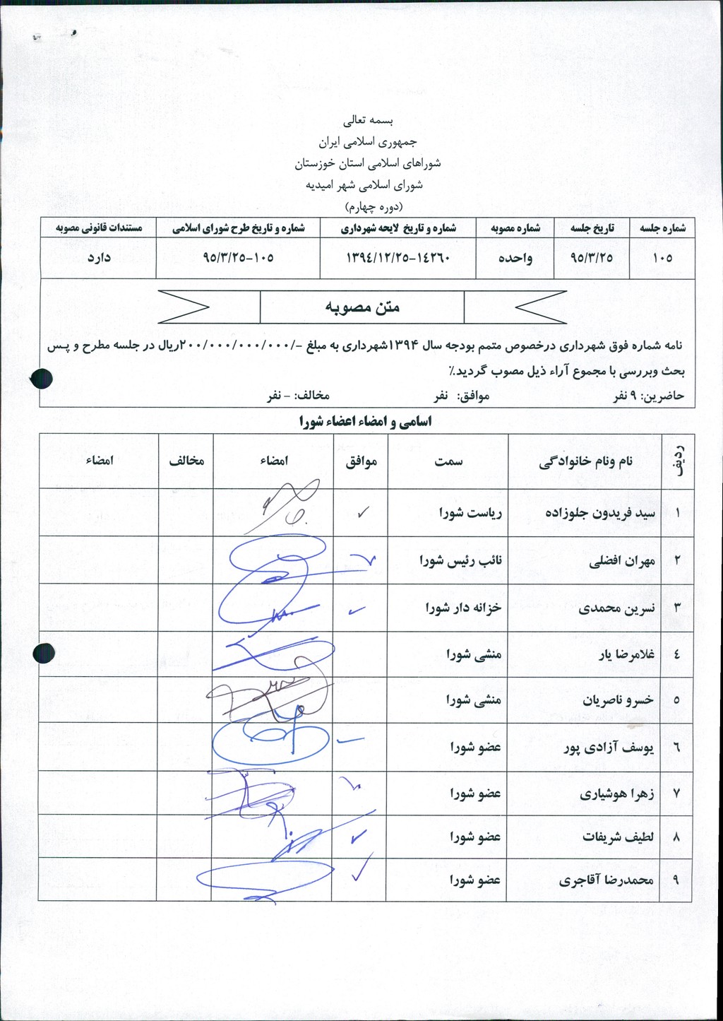 بسم الله الرحمن الرحیم مصوبه شماره ۱ جلسه شماره ۱۰۵ شورای اسلامی شهر امیدیه