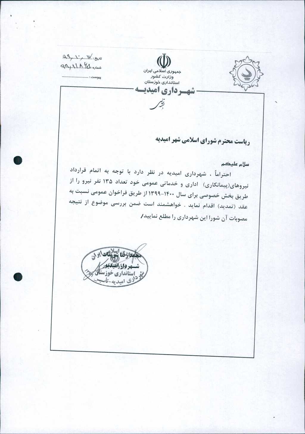 ۱-نامه شماره فوق مبنی بر اینکه شهرداری در نظر دارد، جهت انجام امور خدماتی – اداری خود به تعداد ۱۳۵ نفر نیرو از طریق بخش خصوصی برای سال ۱۴۰۰-۱۳۹۹ از طریق فراخوان عمومی اقدام به عقد قرارداد نماید، موضوع در جلسه مطرح و پس از بحث و بررسی با مجموع آراء ذیل مصوب گردید.