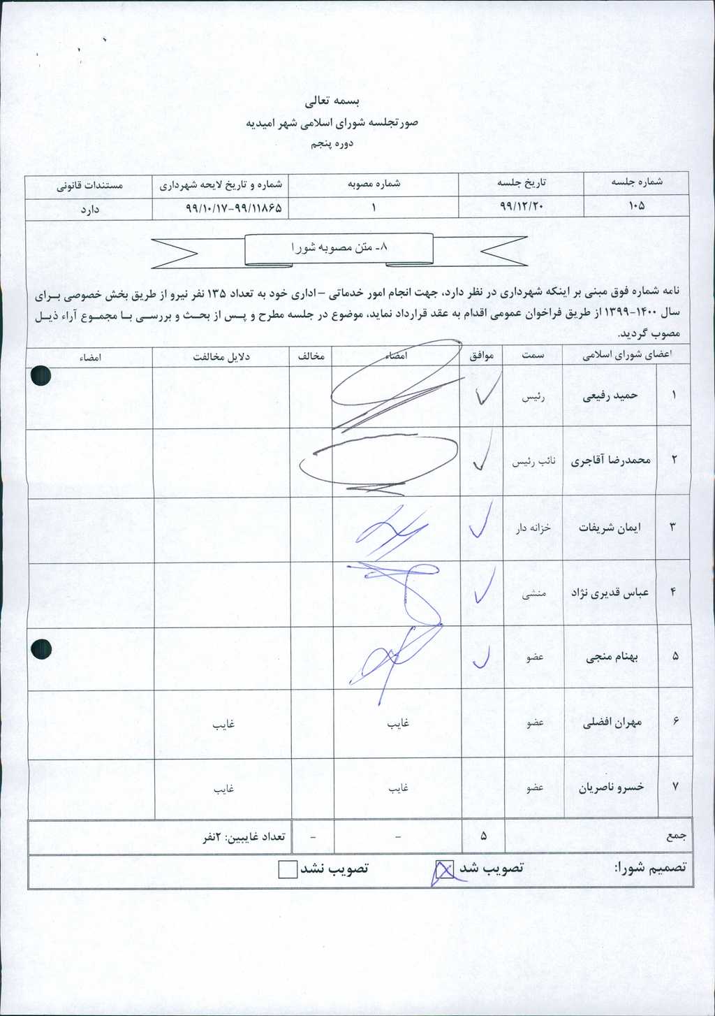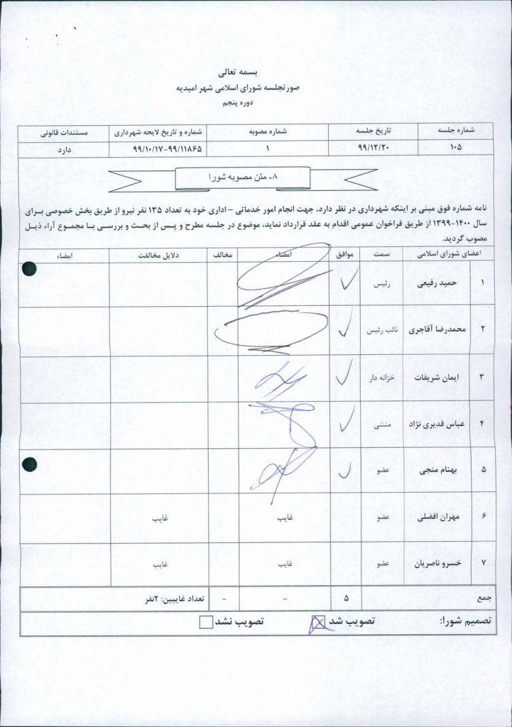 مصوبه شماره ۱ جلسه شماره ۱۰۵ شورای اسلامی شهر امیدیه