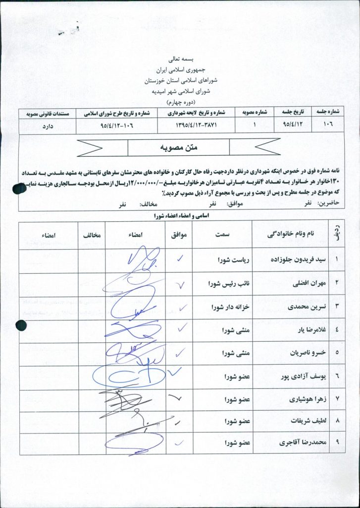 مصوبه شماره ۱ جلسه شماره ۱۰۶ شورای اسلامی شهر امیدیه