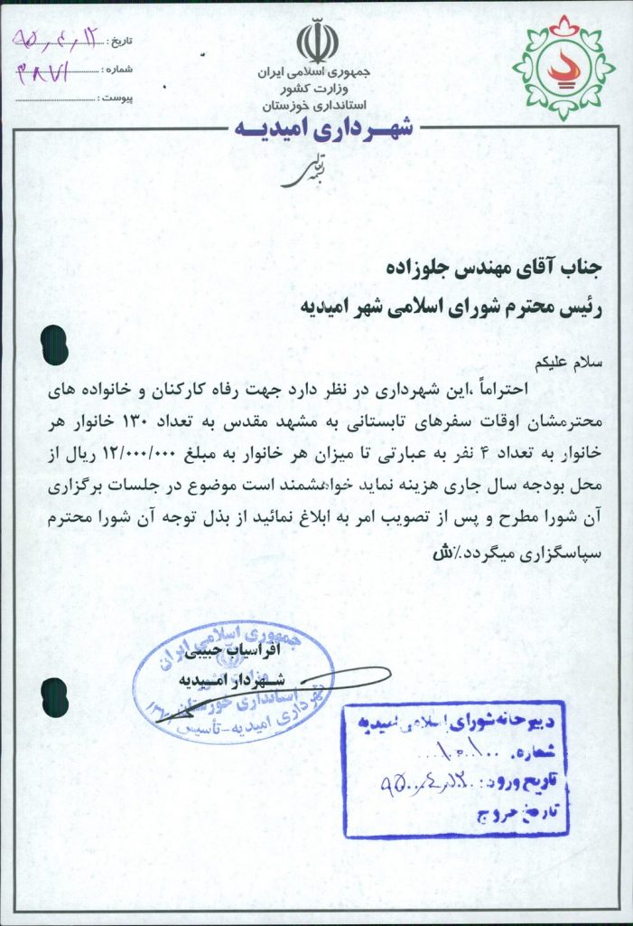 نامه شماره فوق در خصوص اینکه شهرداری درنظر داردجهت رفاه حال کارکنان و خانواده های محترمشان سفرهای تابستانی به مشهد مقدس به تعداد ۱۳۰خانوار هر خانوار به تعداد ۴نفربه عبارتی تامیزان هرخانواربه مبلغ ۱۲۰۰۰۰۰۰ ريال ازمحل بودجه سالجاری هزینه نماید که موضوع در جلسه مطرح و پس از بحث و بررسی با مجموع آراء ذیل مصوب گردید%