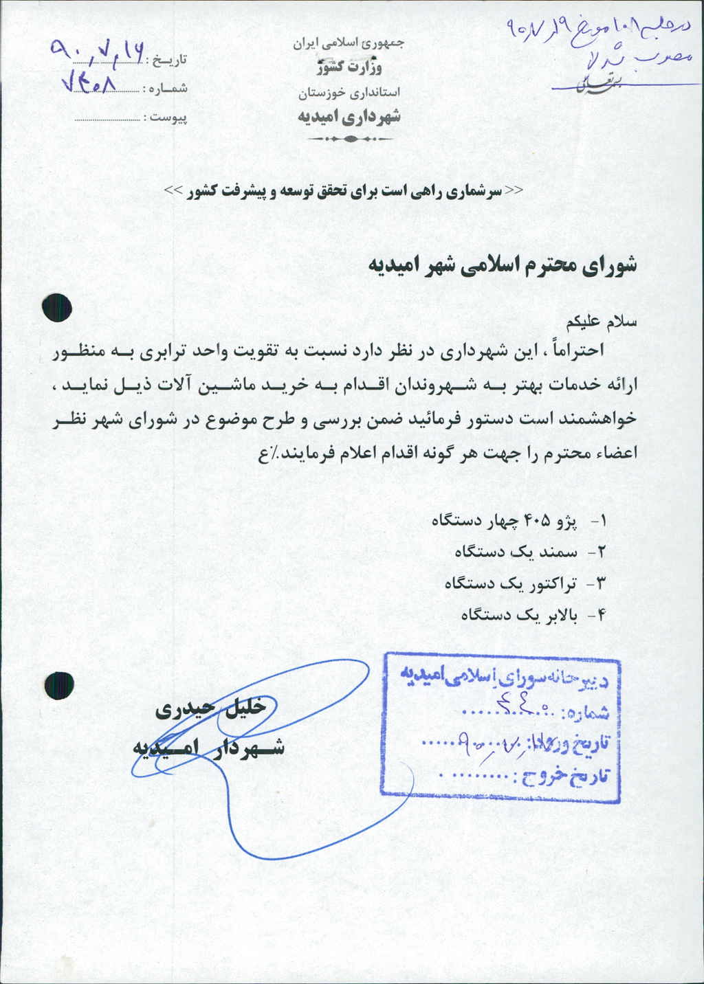 مصوبه شماره ۱ جلسه شماره ۱۰۸ مورخ ۹۰/۷/۱۹ شورای اسلامی شهر امیدیه
