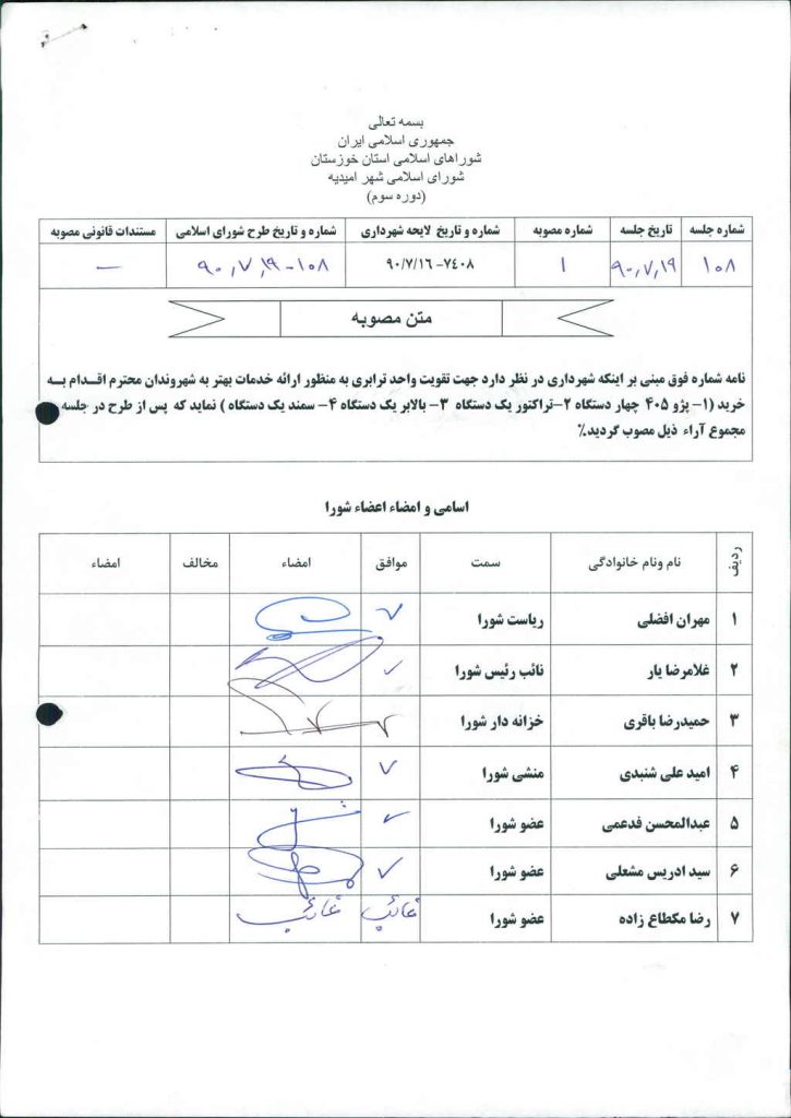 مصوبه شماره ۱ جلسه شماره ۱۰۸ شورای اسلامی شهر امیدیه