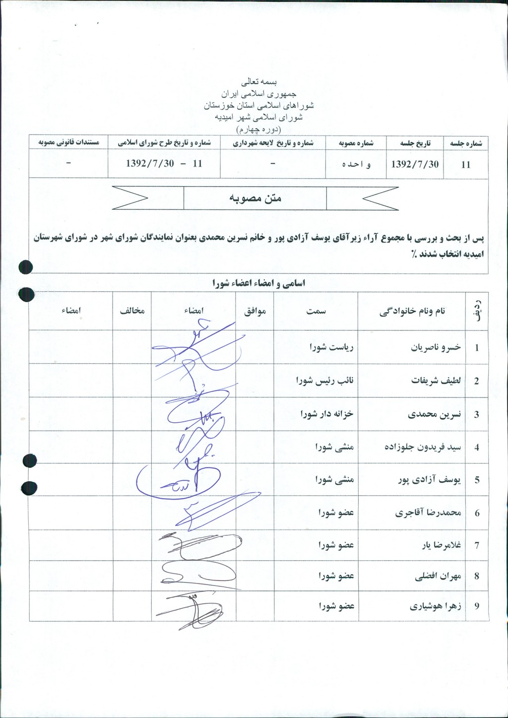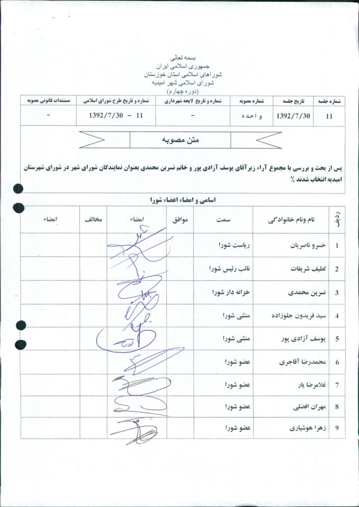 مصوبه شماره ۱ جلسه شماره ۱۱ شورای اسلامی شهر امیدیه