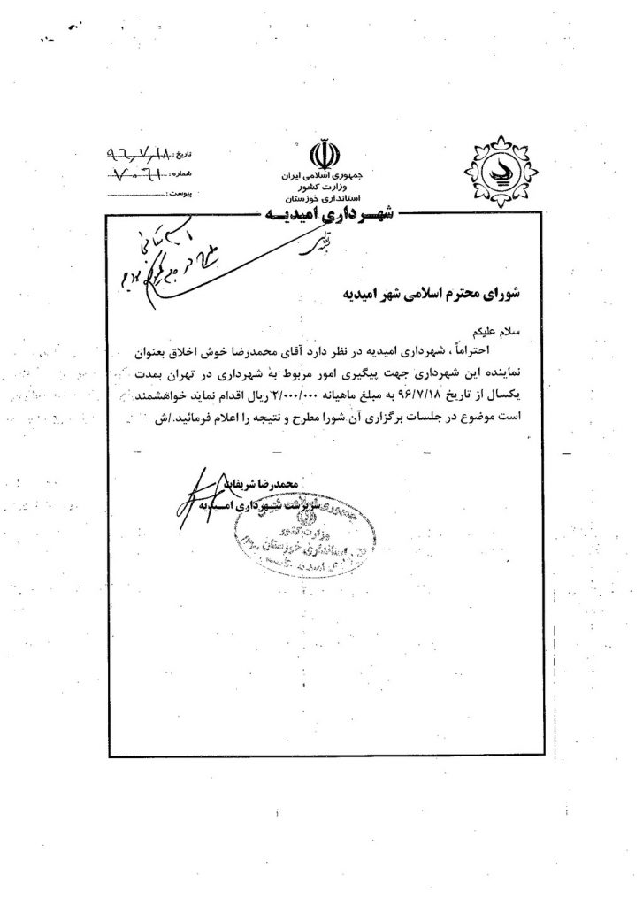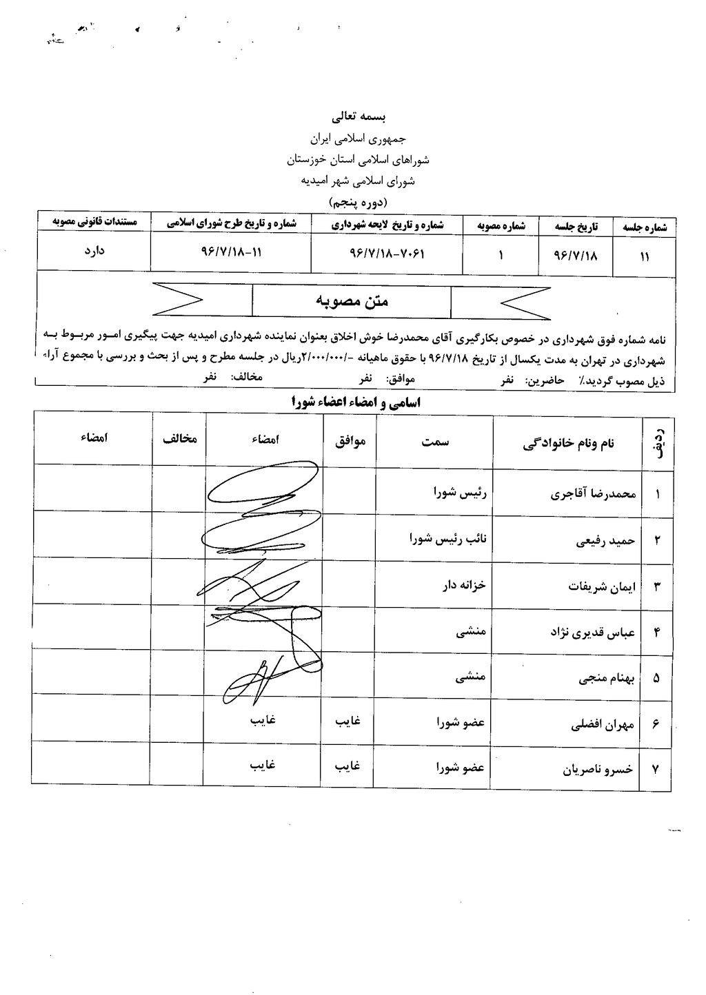نامه شماره فوق شهرداری در خصوص بکارگیری آقای محمدرضا خوش اخلاق بعنوان نماینده شهرداری امیدیه جهت پیگیری امور مربوط به شهرداری در تهران به مدت یکسال از تاریخ ۱۸/۷/۹۶ با حقوق ماهیانه ۲۰۰۰۰۰۰ریال در جلسه مطرح و پس از بحث و بررسی با مجموع آراء ذیل مصوب گردید%
