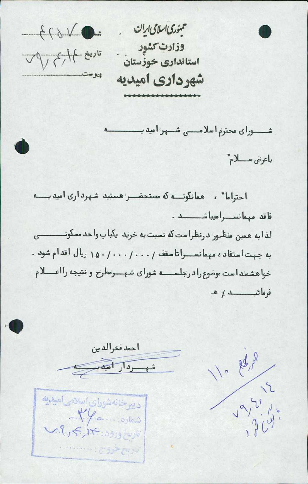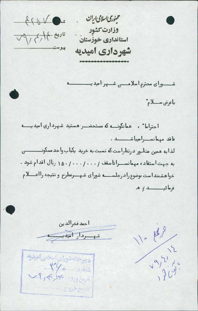 مصوبه شماره ۱ جلسه شماره ۱۱۰ مورخ ۷۹/۴/۱۴ شورای اسلامی شهر امیدیه