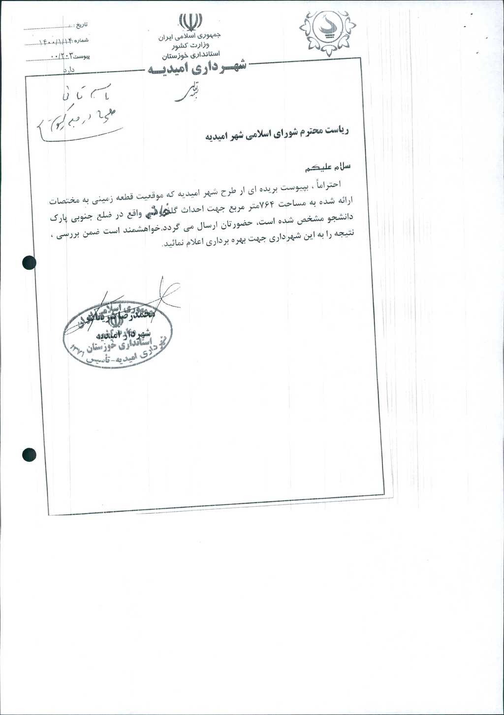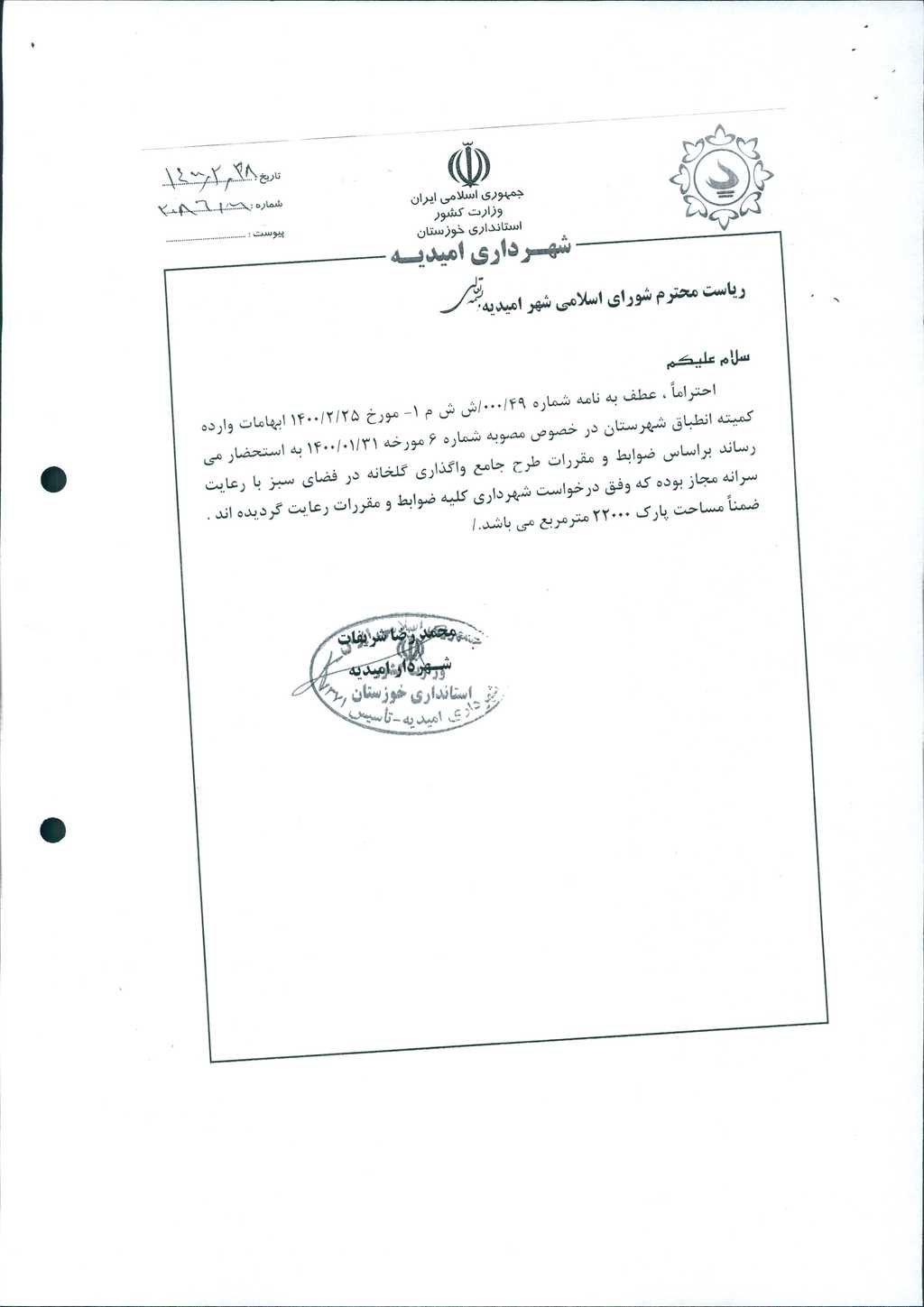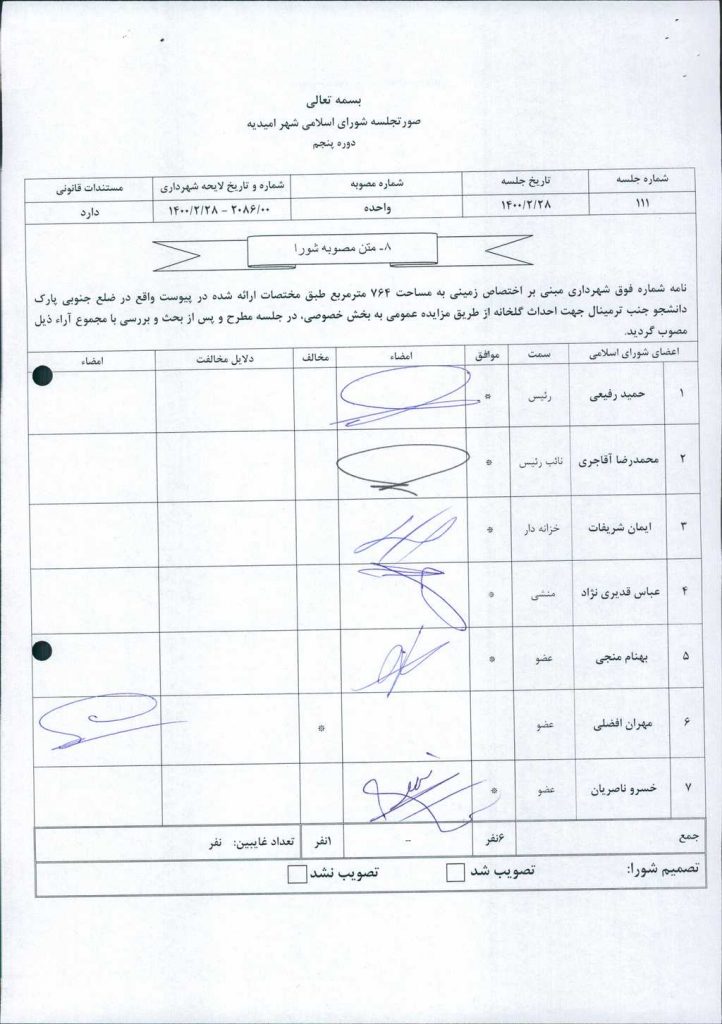 مصوبه شماره ۱ جلسه شماره ۱۱۱ شورای اسلامی شهر امیدیه