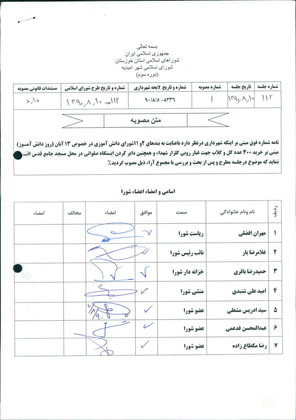 مصوبه شماره ۱ جلسه شماره ۱۱۲ شورای اسلامی شهر امیدیه