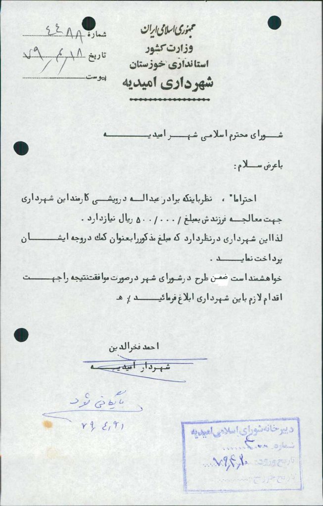 ۱-نامه شماره ۴۴۸۸ مورخ ۱۸/ ۴/ ۷۹ شهرداري قرائت شد مبني بر كمك بلا عوض به آقاي عبدالله درويشي كارمند شهرداري با شش رأي موافق مصوب گرديد مبلغ مذكور بعنوان مساعده و با اقساط چند ماهه پرداخت گردد.