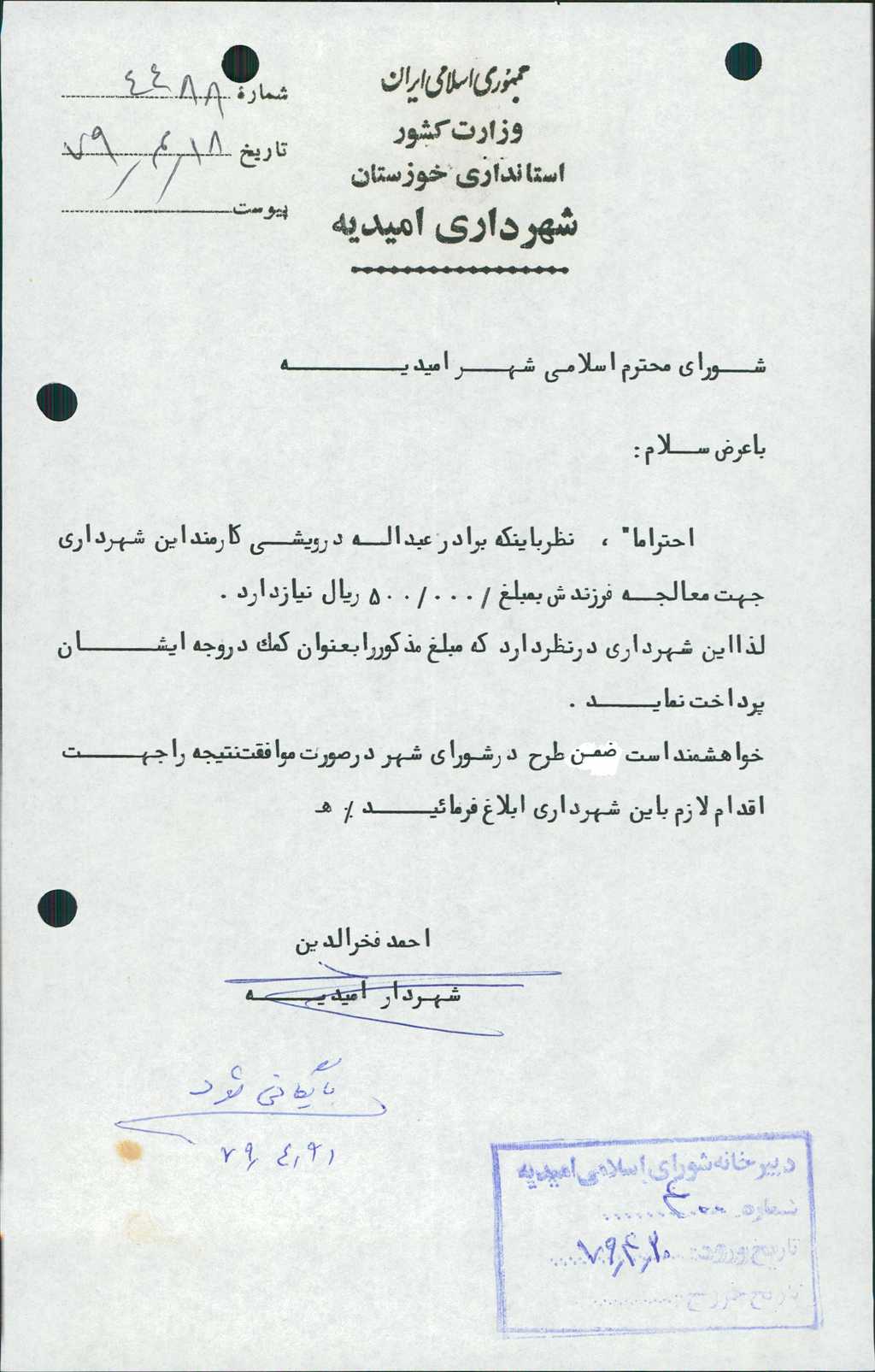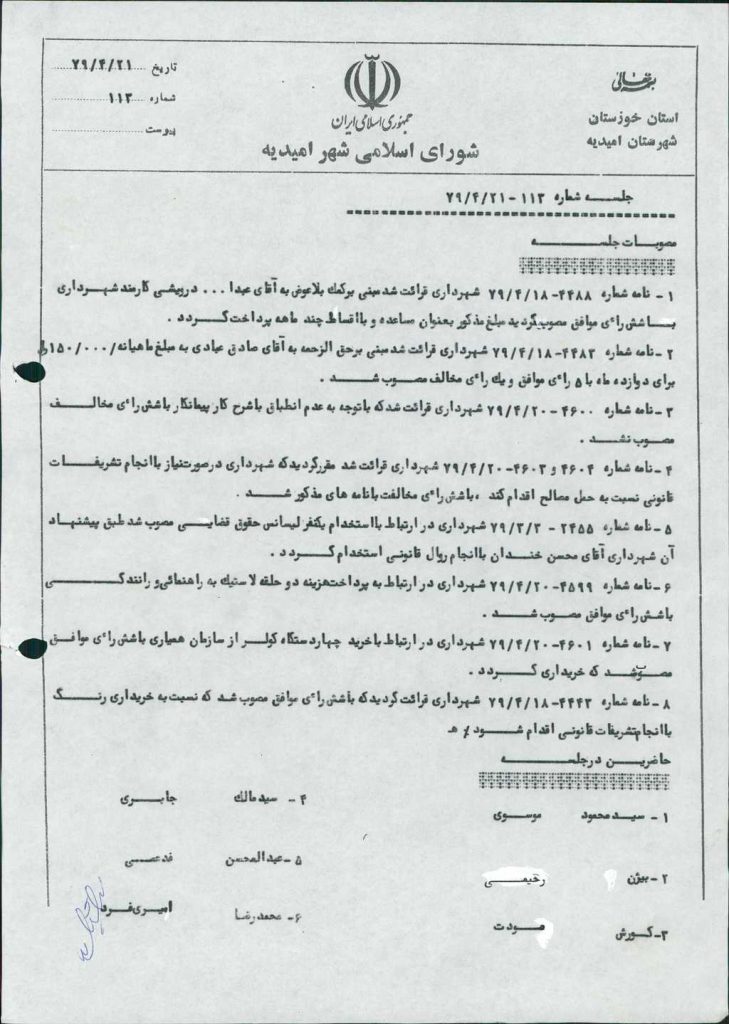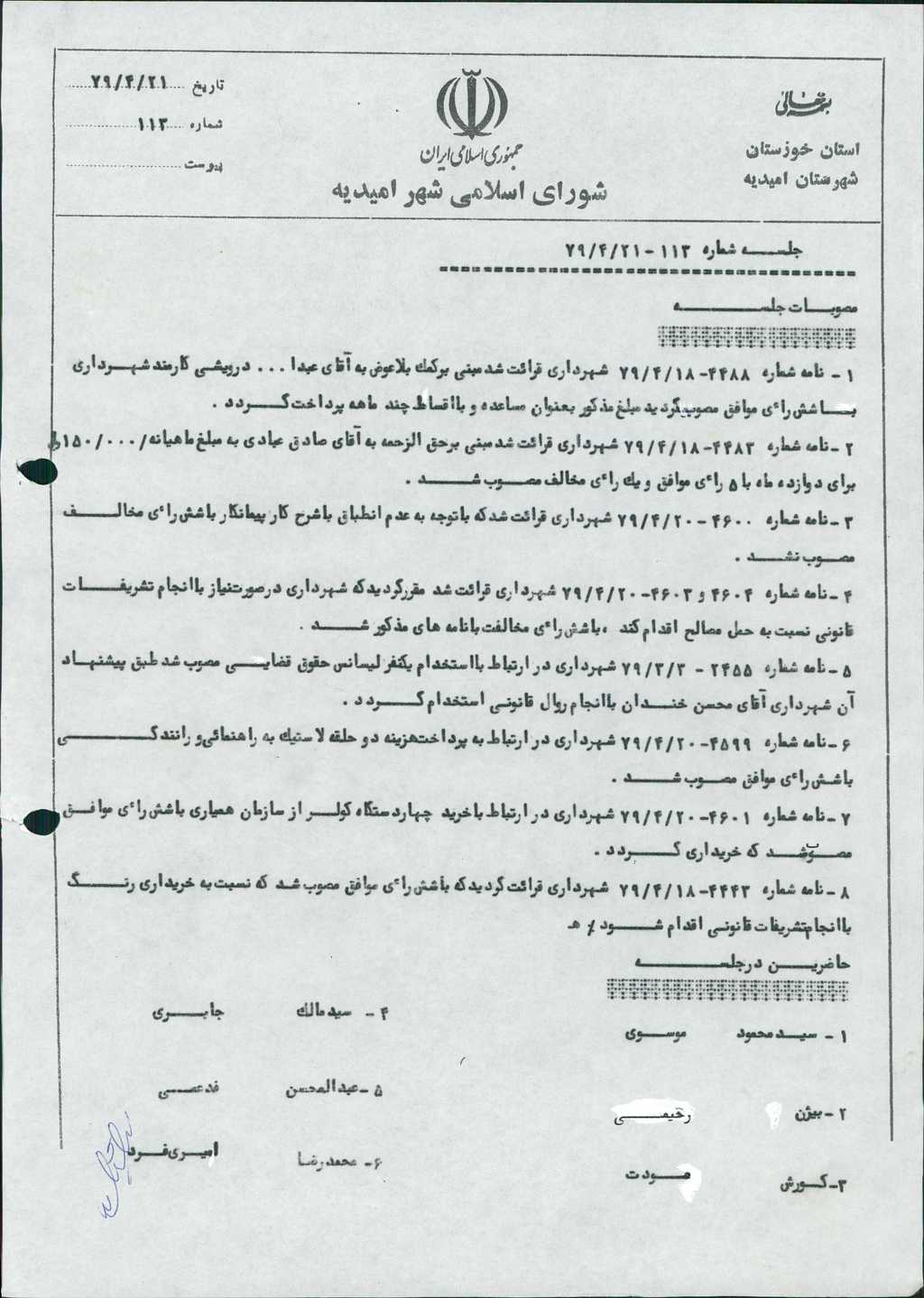 مصوبه شماره ۱ جلسه شماره ۱۱۳ مورخ ۷۹/۴/۲۱ شورای اسلامی شهر امیدیه