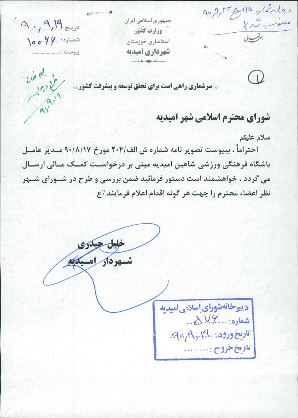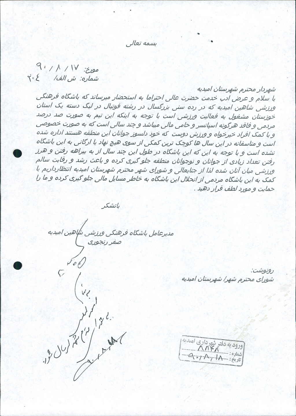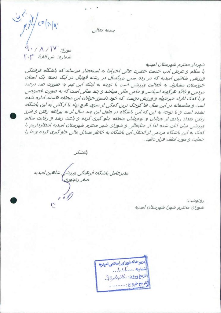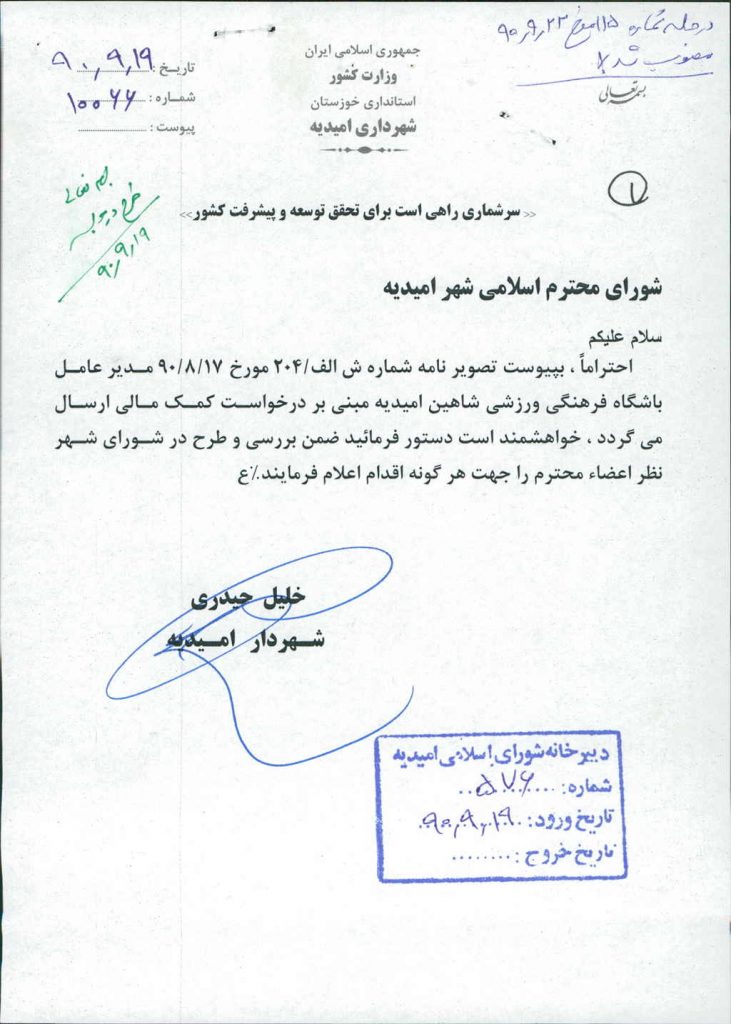 نامه شماره فوق شهرداری در خصوص مساعدت به باشکاه فرهنگی ورزشی شاهین امیدیه( با عنایت به درخواست مدیر باشگاه) به مبلغ بیست و پنج میلیون ریال در جلسه مطرح و پس از بحث و بررسی با مجموع آراء ذیل مصوب گردید%