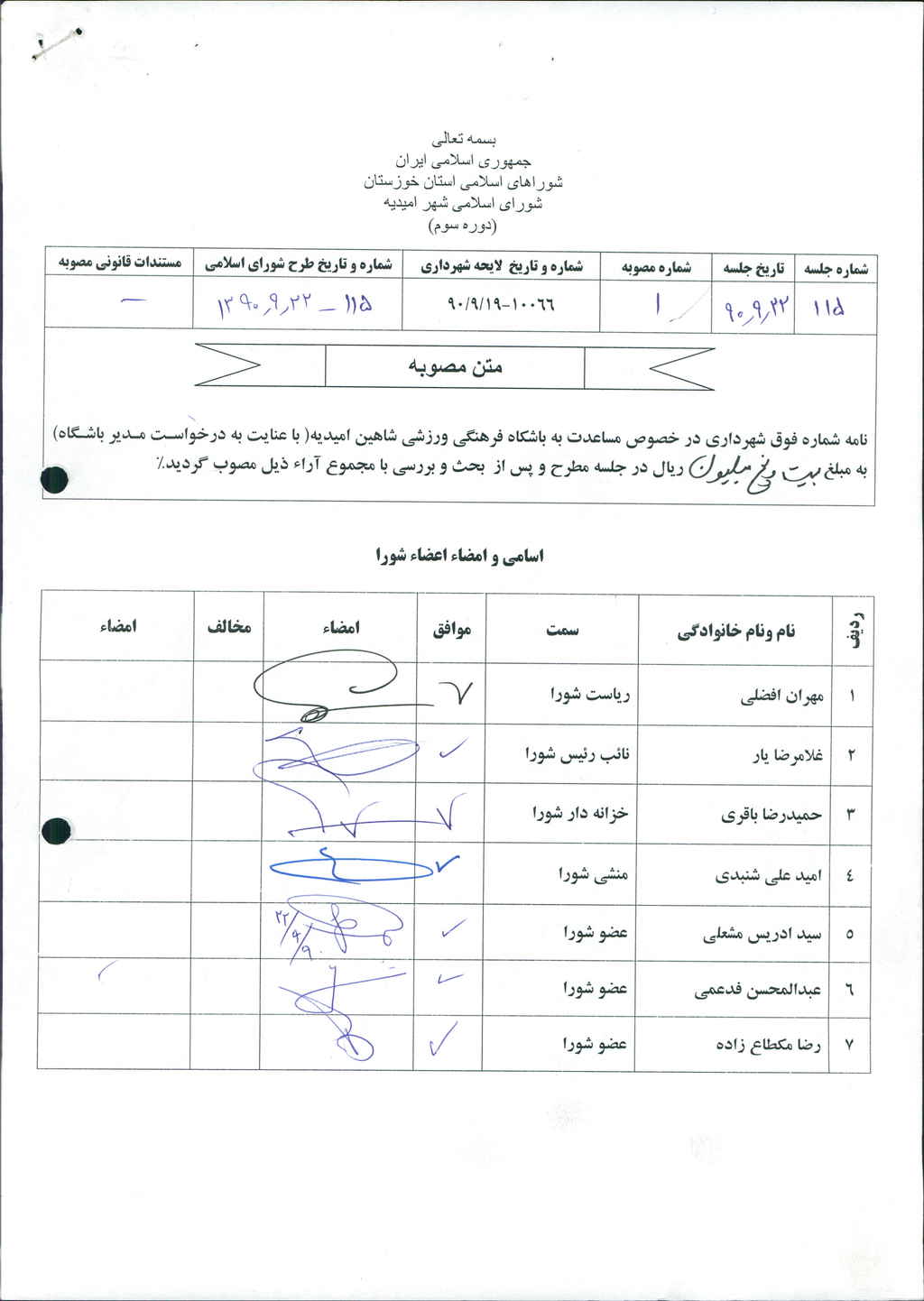 مصوبه شماره ۱ جلسه شماره ۱۱۵ شورای اسلامی شهر امیدیه