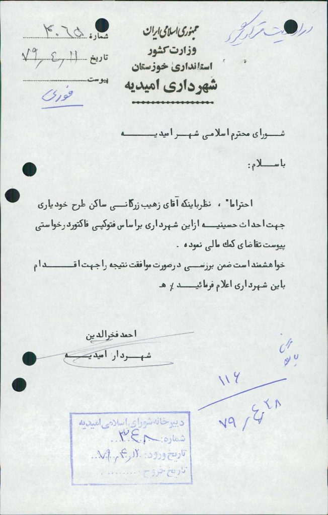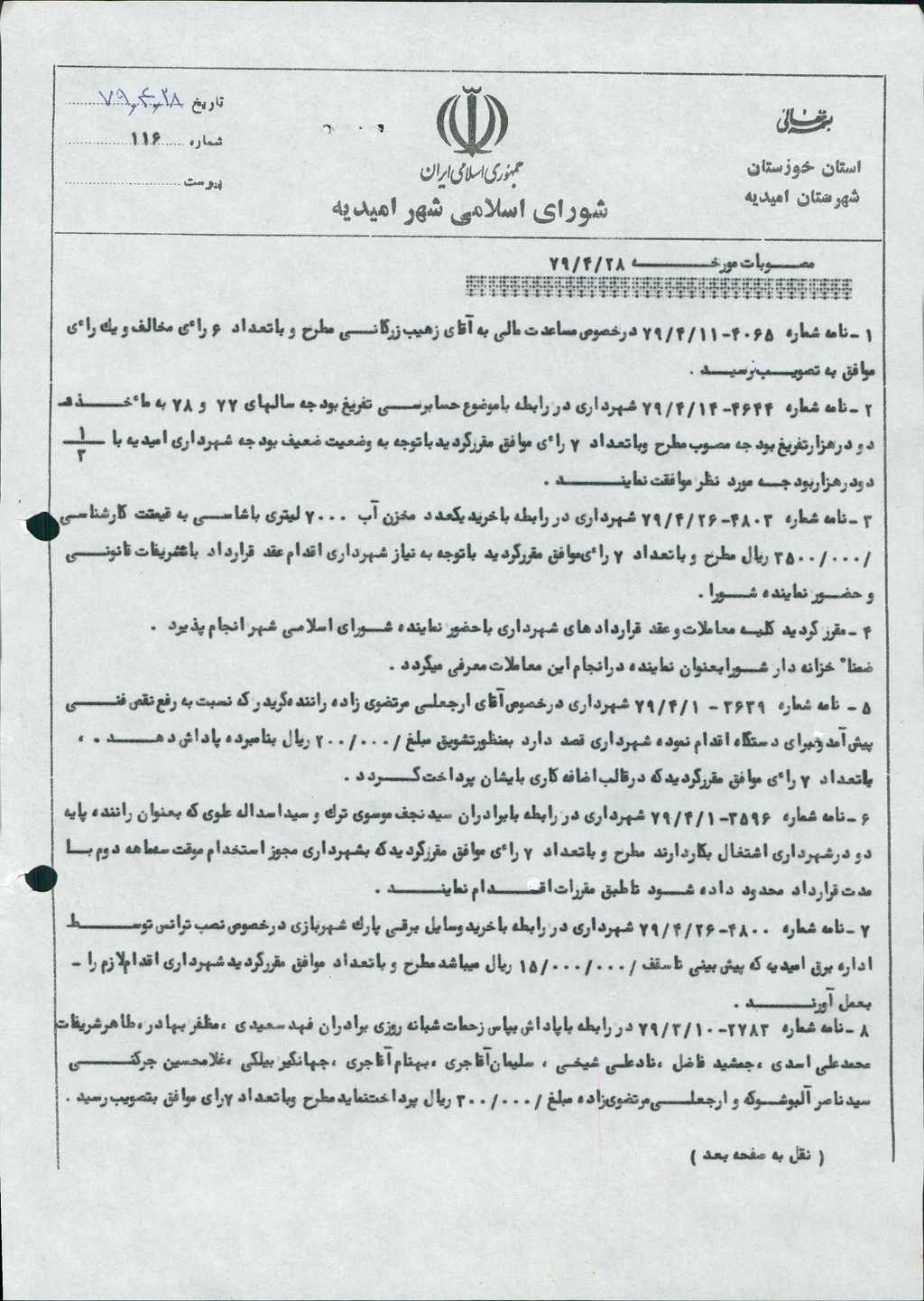 ۱-نامه شماره ۴۰۶۵مورخه ۱۱/ ۴/ ۷۹ در خصوص مساعدت مالي به آقاي زهيب زرگاني مطرح و با تعداد ۶ رأي مخالف و يك رأي موافق به تصويب نرسيد.