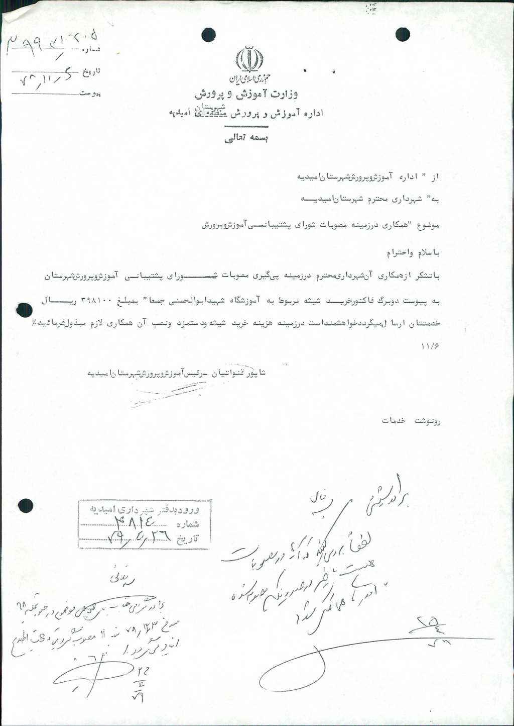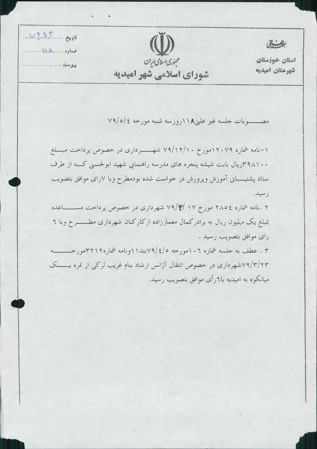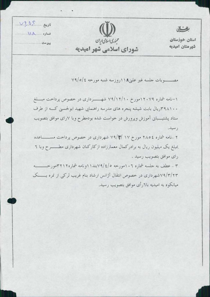 ۱-نامه شماره ۱۲۰۷۹مورخه ۱۰/ ۱۲/ ۷۹ شهرداري در خصوص پرداخت مبلغ-/۱۰۰/ ۳۹۸ريال بابت شيشه پنجره هاي مدرسه راهنمايي شهيد ابوالحسني كه از طرف ستاد پشتيباني آموزش و پرورش درخواست شده بود مطرح و با ۷ رأي موافق بتصويب رسيد.