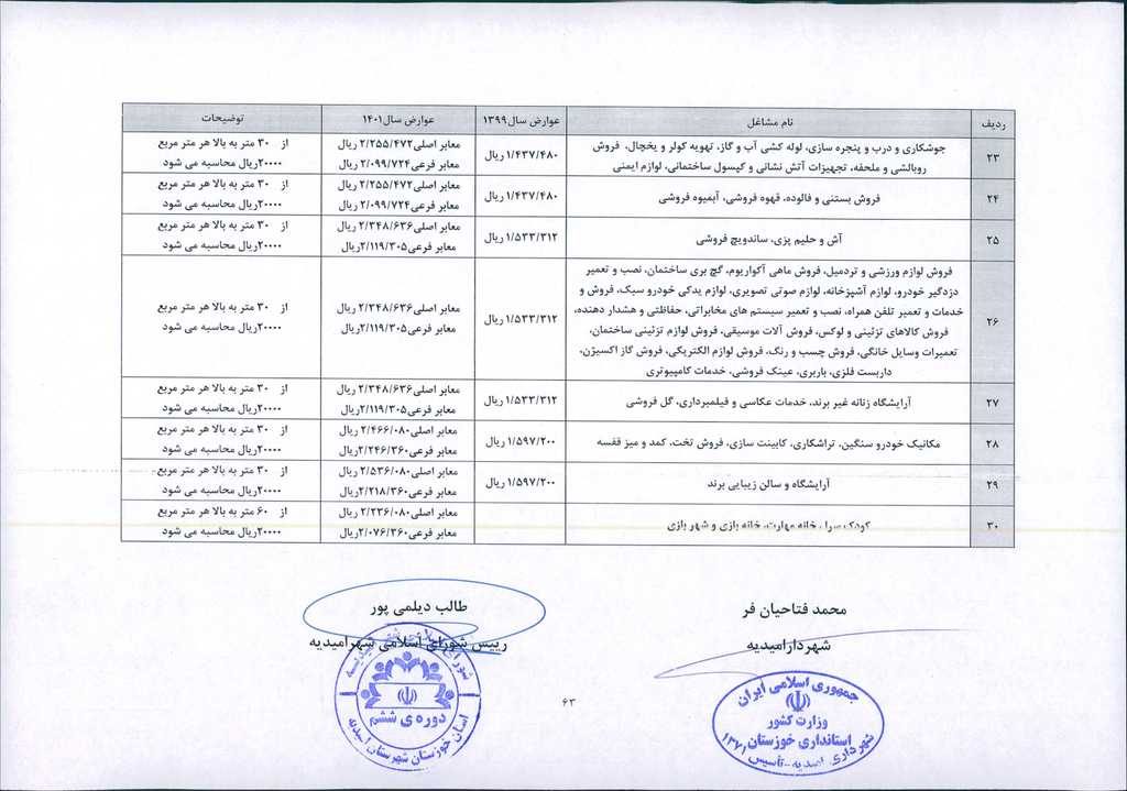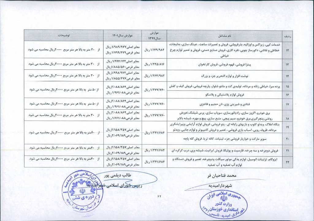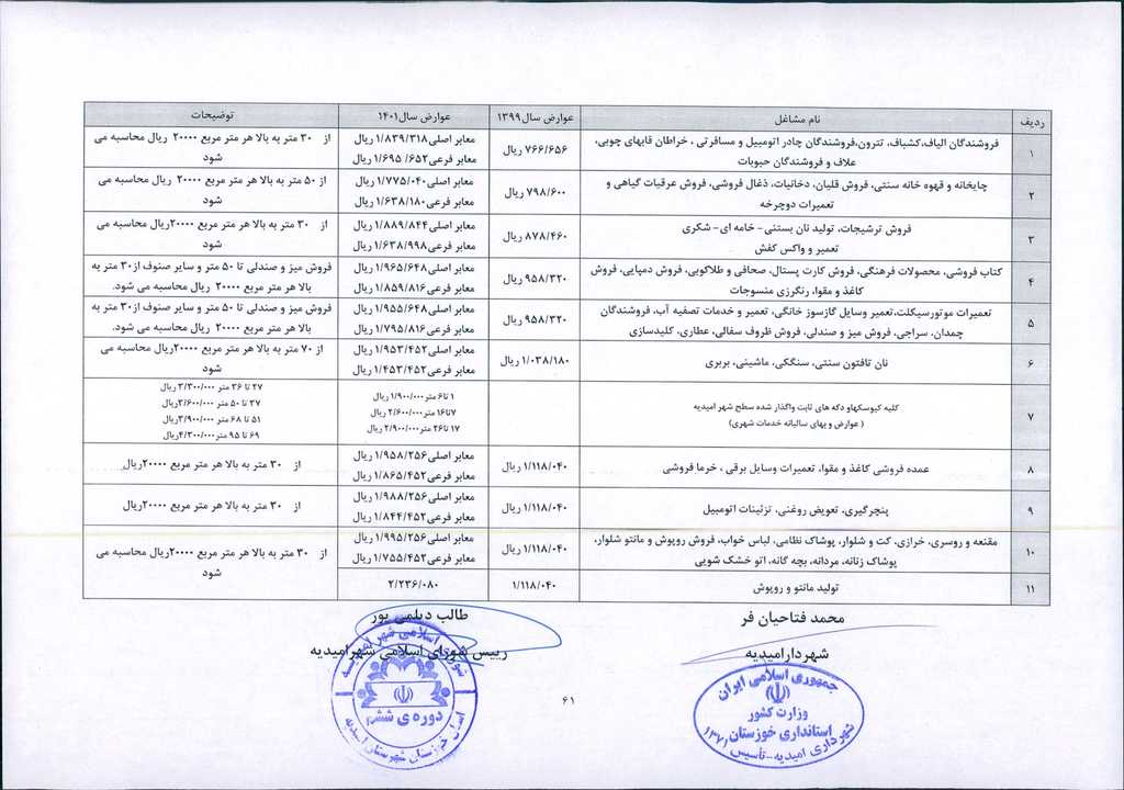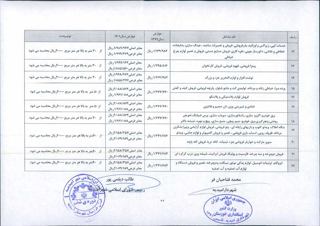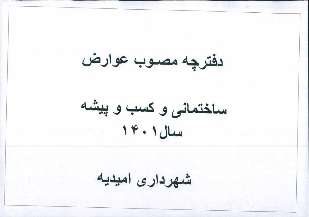 نامه شماره فوق شهرداری امیدیه مبنی بر یک جلد دفترچه پیشنهادی عوارض ساختمانی، بهای خدمات و کسب و پیشه مربوط به سال ۱۴۰۱ در جلسه مطرح و پس از بحث و بررسی با مجموع آراء ذیل مصوب گردید.
