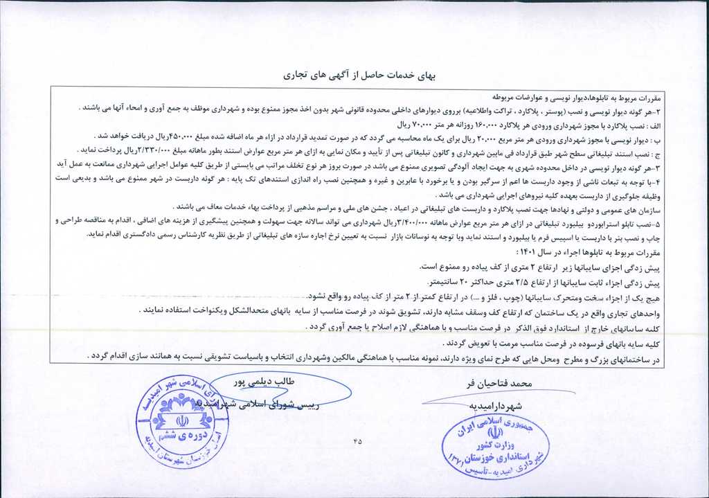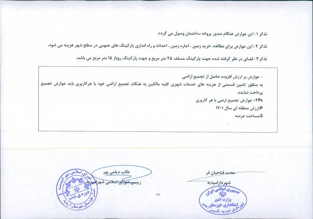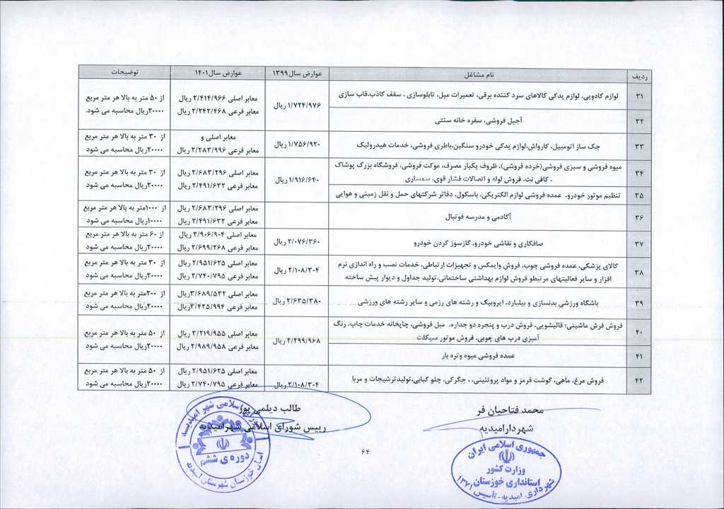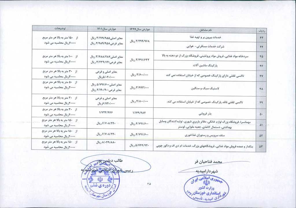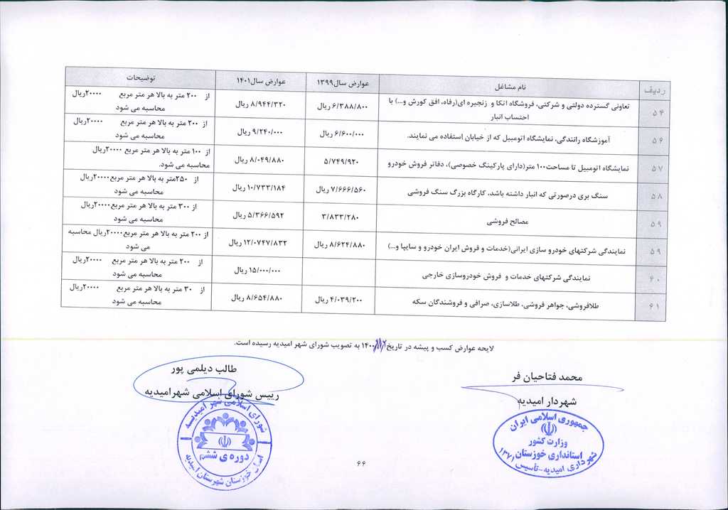 نامه شماره فوق شهرداری امیدیه مبنی بر یک جلد دفترچه پیشنهادی عوارض ساختمانی، بهای خدمات و کسب و پیشه مربوط به سال ۱۴۰۱ در جلسه مطرح و پس از بحث و بررسی با مجموع آراء ذیل مصوب گردید.