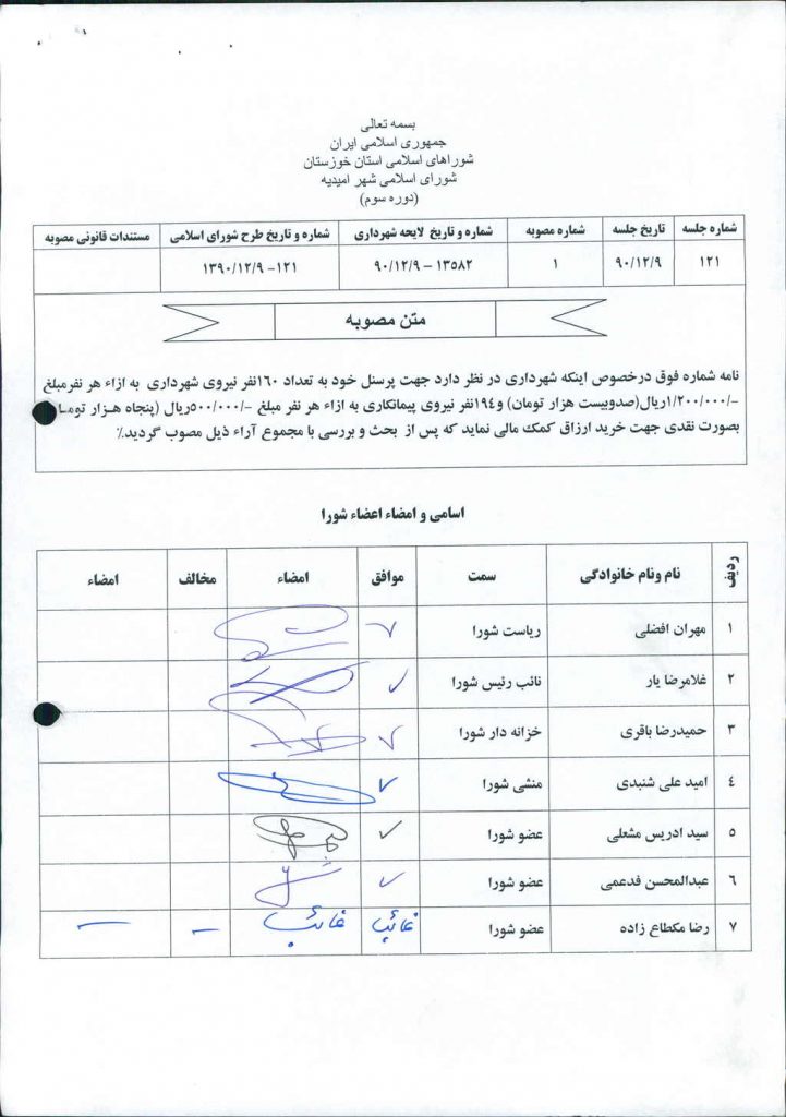 مصوبه شماره ۱ جلسه شماره ۱۲۱ شورای اسلامی شهر امیدیه