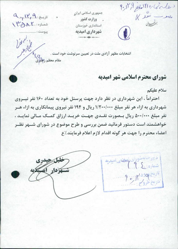 نامه شماره فوق در خصوص اینکه شهرداری در نظر دارد جهت پرسنل خود به تعداد ۱۶۰نفر نیروی شهرداری به ازاء هر نفرمبلغ -/۰۰۰/ ۲۰۰/ ۱ریال (صد و بیست هزار تومان) و ۱۹۴ نفر نیروی پیمانکاری به ازاء هر نفر مبلغ -/۰۰۰/ ۵۰۰ریال (پنجاه هزار تومان ) بصورت نقدی جهت خرید ارزاق کمک مالی نماید که پس از بحث و بررسی با مجموع آراء ذیل مصوب گردید%