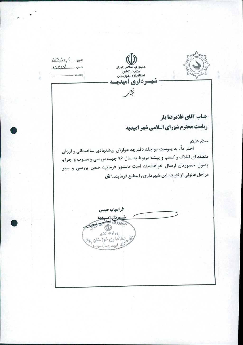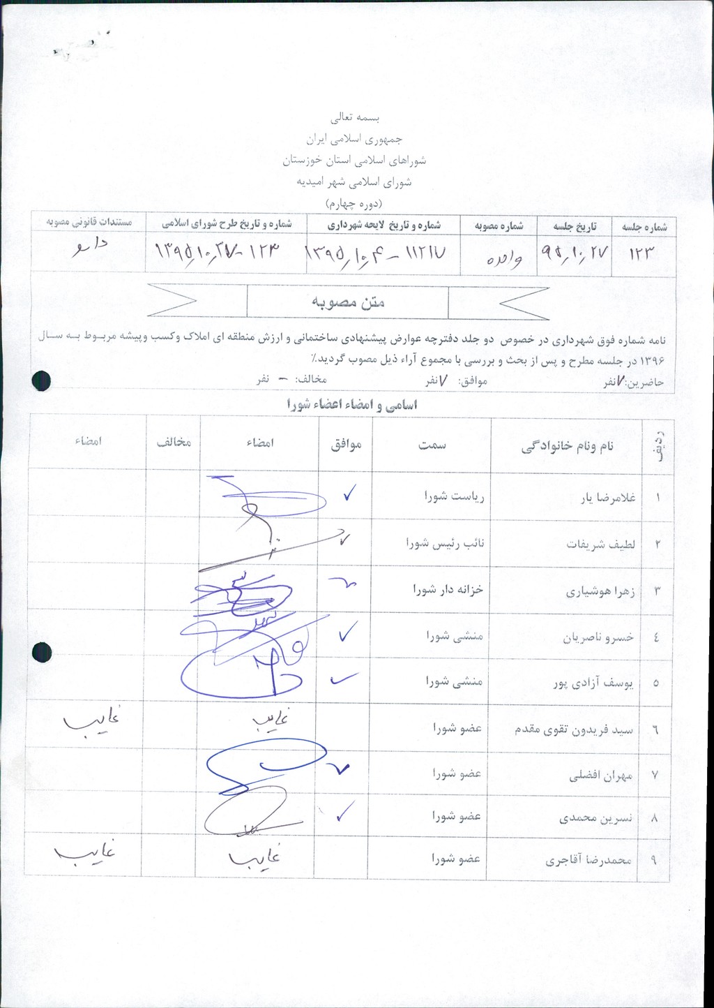 مصوبه شماره ۱ جلسه شماره ۱۲۳ شورای اسلامی شهر امیدیه