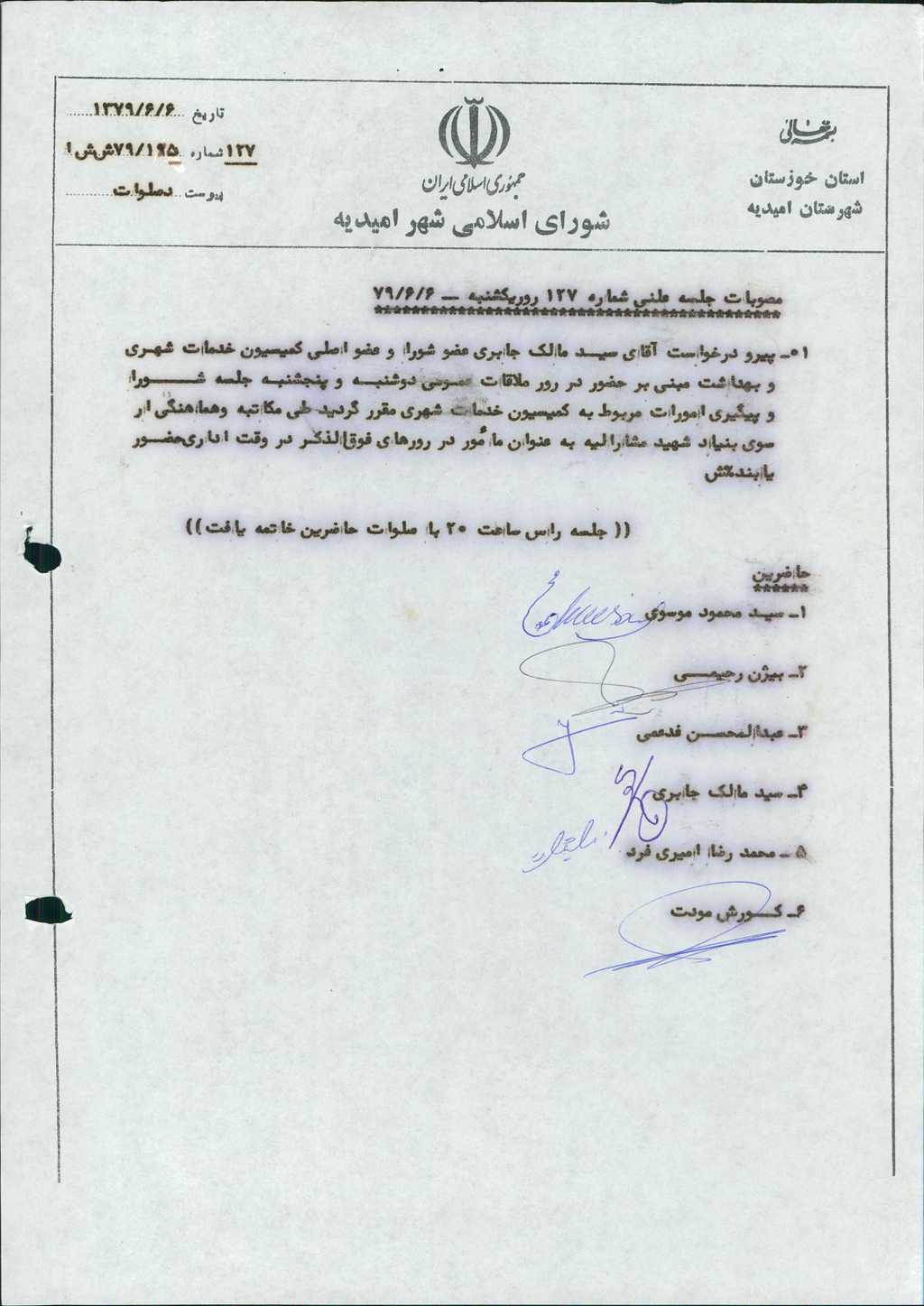 مصوبه شماره ۱ جلسه شماره ۱۲۷ شورای اسلامی شهر امیدیه