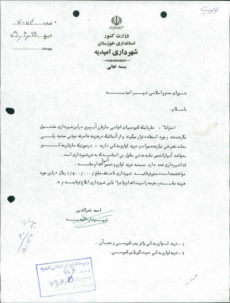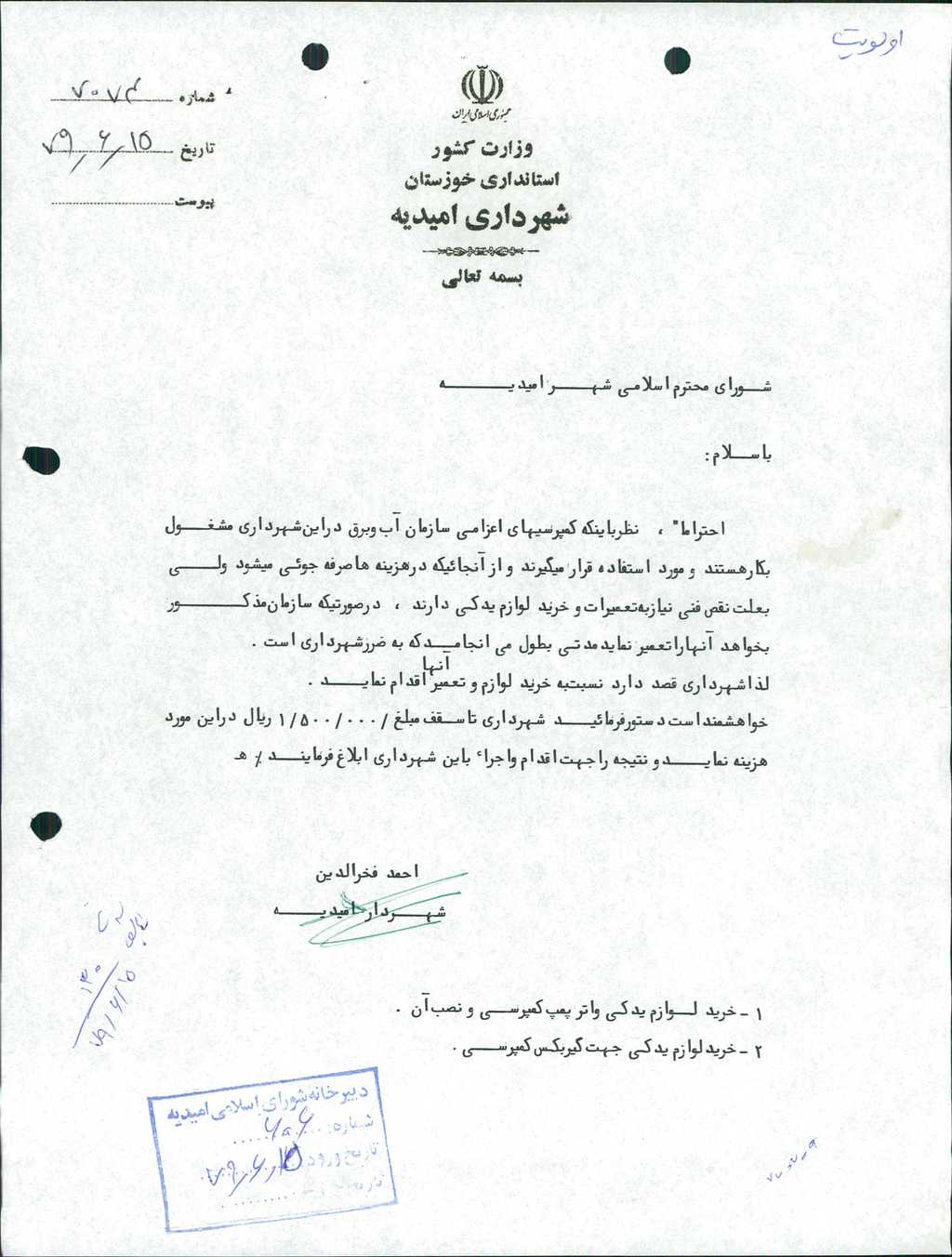 بسم الله الرحمن الرحیم مصوبه شماره ۱ جلسه شماره ۱۳۰ شورای اسلامی شهر امیدیه