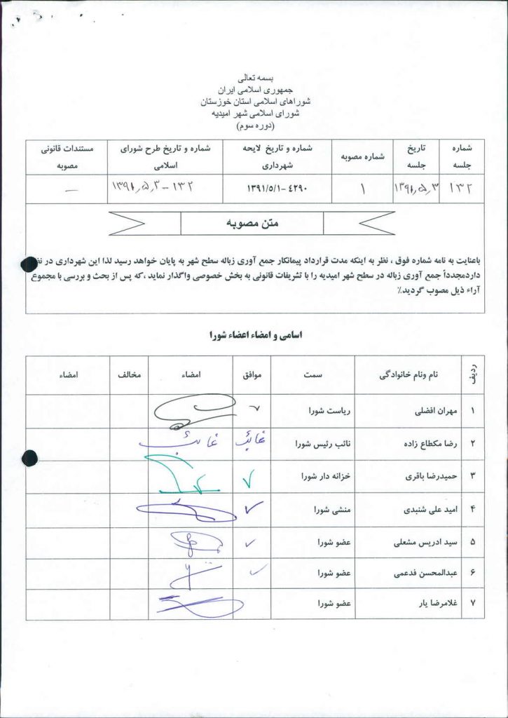 مصوبه شماره ۱ جلسه شماره ۱۳۲ شورای اسلامی شهر امیدیه