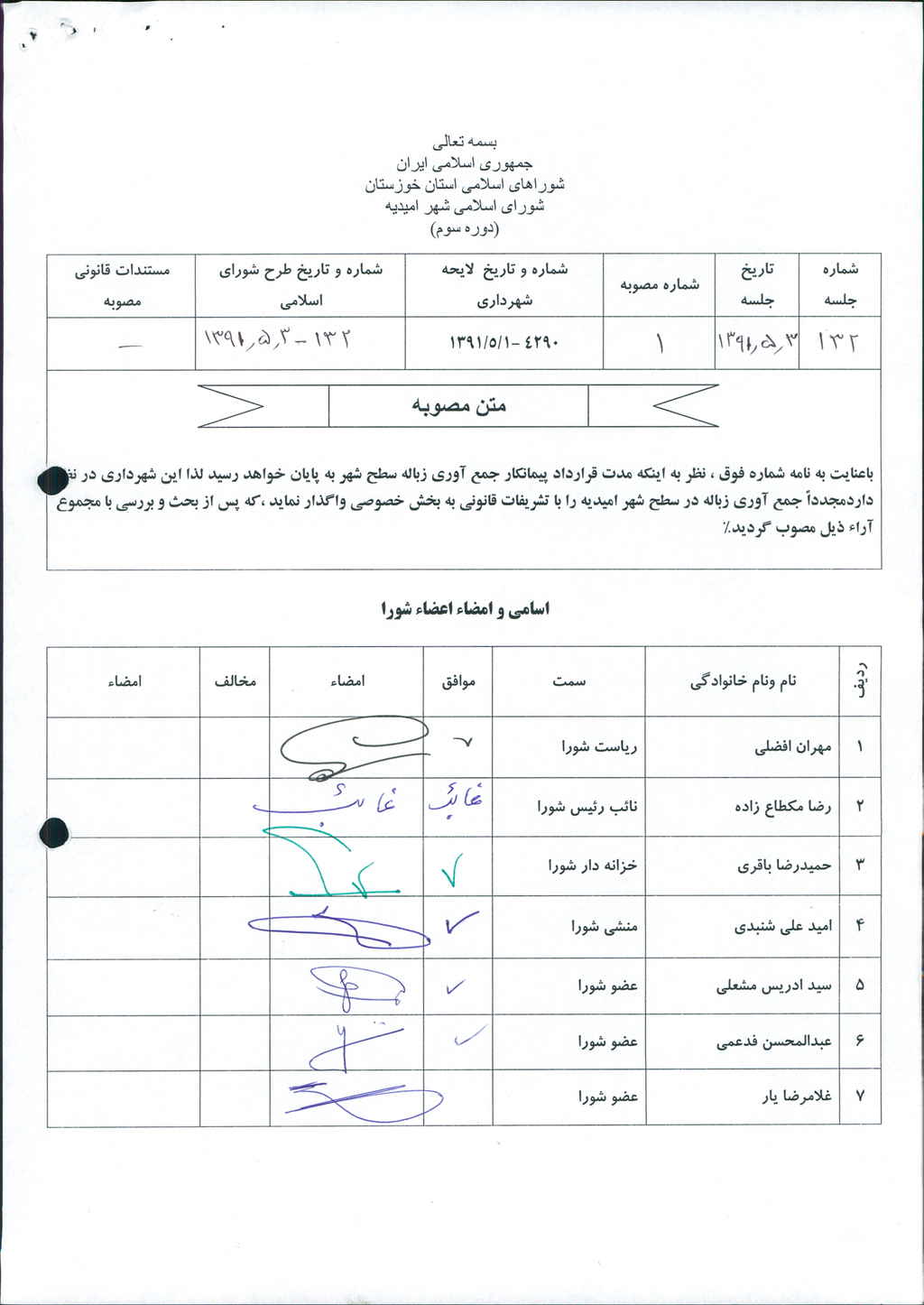 مصوبه شماره ۱ جلسه شماره ۱۳۲ مورخ ۹۱/۵/۳ شورای اسلامی شهر امیدیه