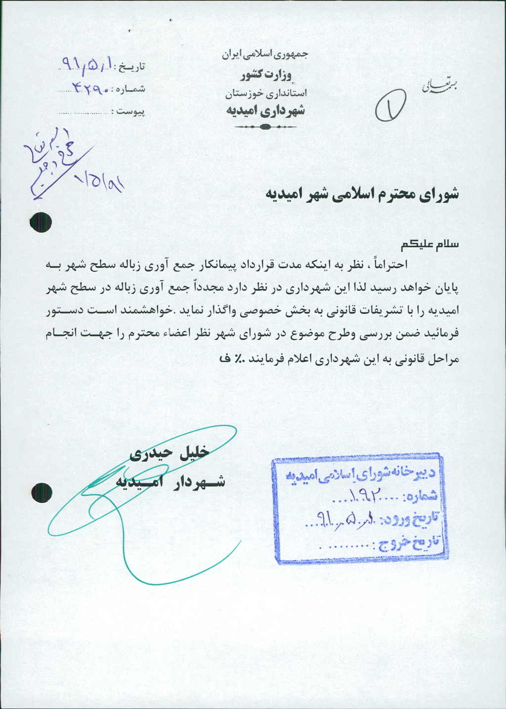 باعنایت به نامه شماره فوق ، نظر به اینکه مدت قرارداد پیمانکار جمع آوری زباله سطح شهر به پایان خواهد رسید لذا این شهرداری در نظر داردمجدداً جمع آوری زباله در سطح شهر امیدیه را با تشریفات قانونی به بخش خصوصی واگذار نماید ،که پس از بحث و بررسی با مجموع آراء ذیل مصوب گردید%