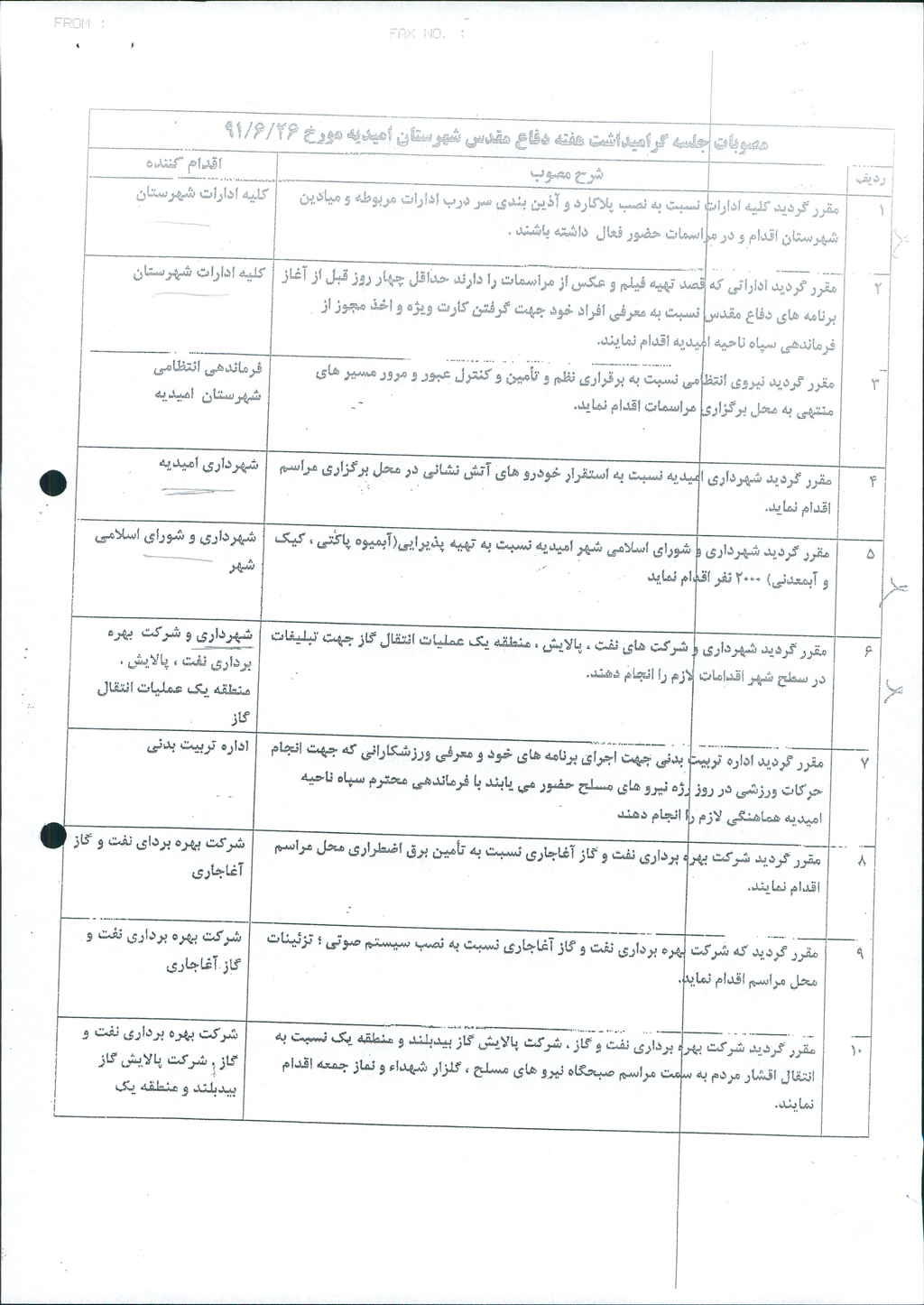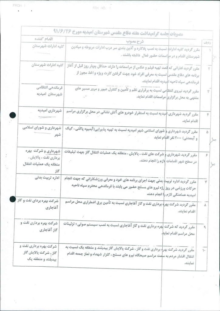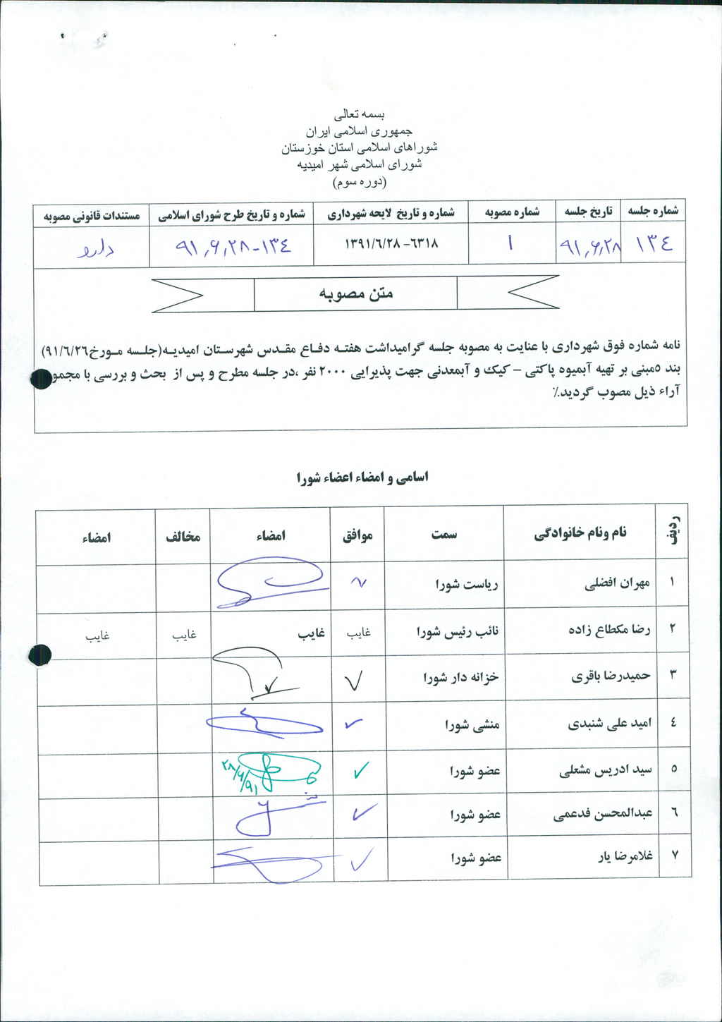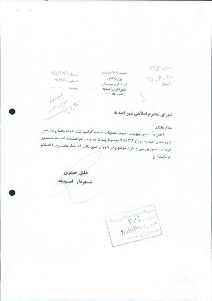 مصوبه شماره ۱ جلسه شماره ۱۳۴ مورخ ۹۱/۶/۲۸ شورای اسلامی شهر امیدیه