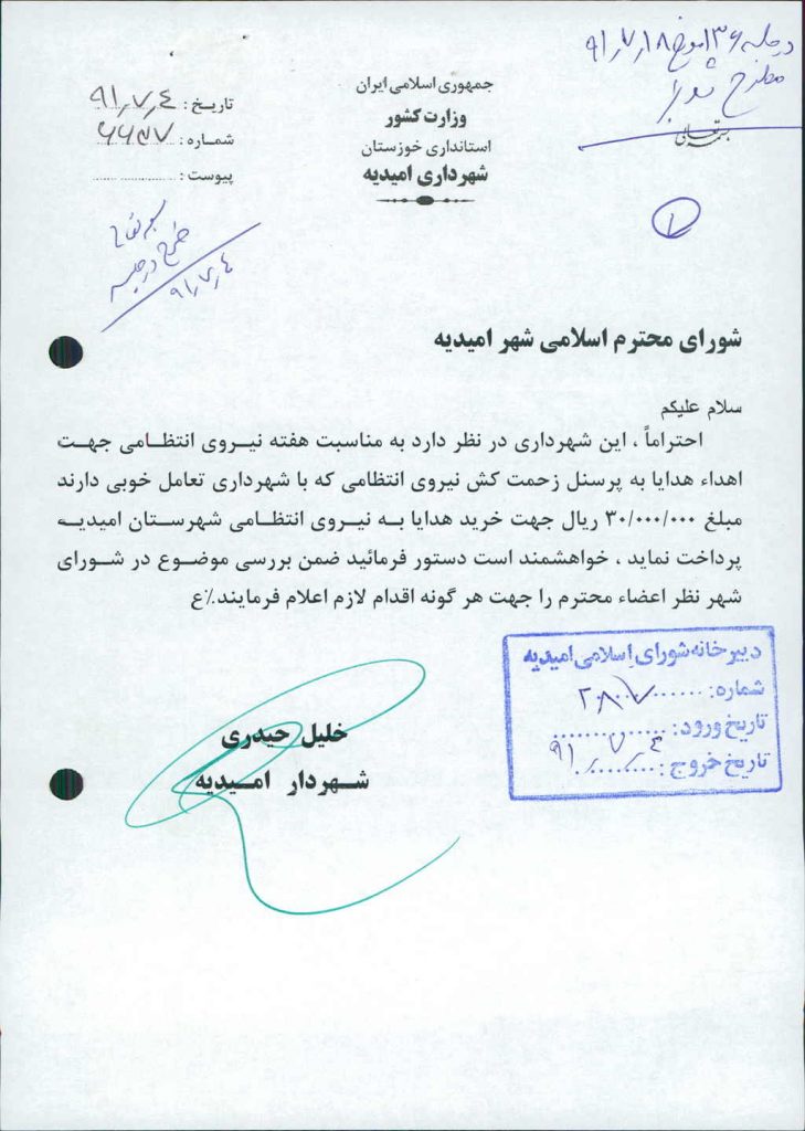 نامه شماره فوق مبنی بر اینکه شهرداری در نظر دارد به مناسبت هفته نیروی انتظامی جهت تقدیر از پرسنل زحمت کش نیروی انتظامی که با شهرداری تعامل خوبی دارندتامبلغ ۰۰۰/۰۰۰/ ۳۰ريال جهت خريد هدايا به نيروي انتظامي پرداخت نمايد كه موضوع در جلسه مطرح و پس از بحث و بررسی با مجموع آراء ذیل مصوب گردید%