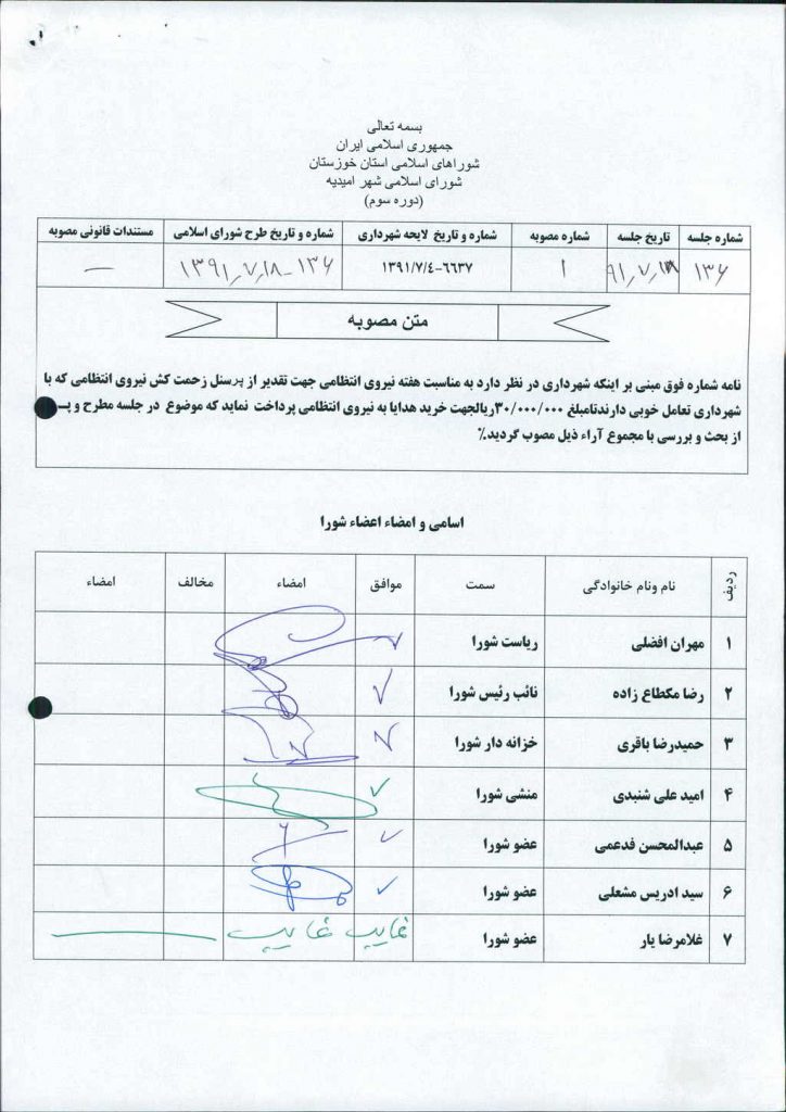 مصوبه شماره ۱ جلسه شماره ۱۳۶ شورای اسلامی شهر امیدیه