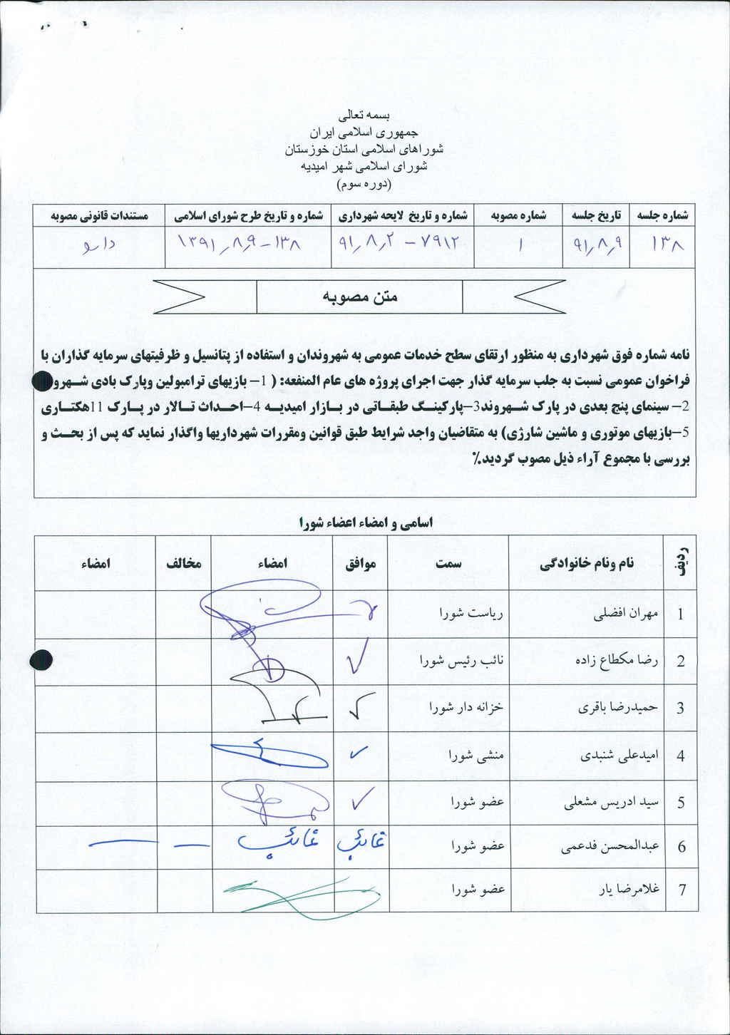 مصوبه شماره ۱ جلسه شماره ۱۳۸ مورخ ۹۱/۸/۹ شورای اسلامی شهر امیدیه