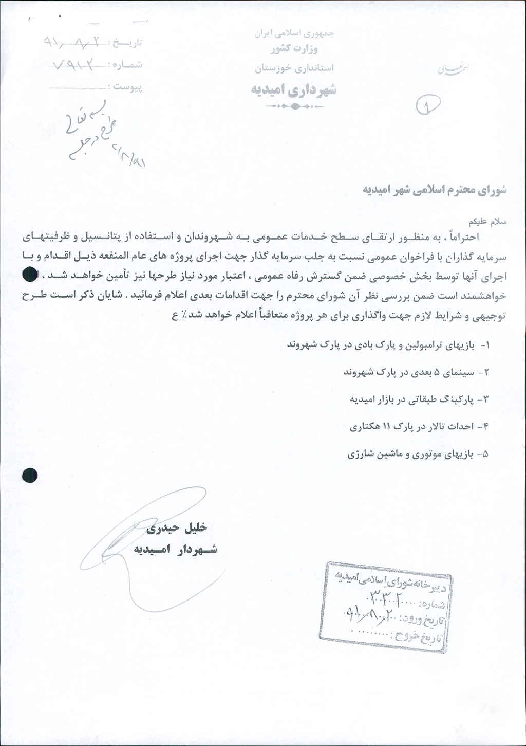نامه شماره فوق شهرداری به منظور ارتقای سطح خدمات عمومی به شهروندان و استفاده از پتانسیل و ظرفیتهای سرمایه گذاران با فراخوان عمومی نسبت به جلب سرمایه گذار جهت اجرای پروژه های عام المنفعه: ( ۱- بازیهای ترامبولین وپارک بادی شهروند ۲- سینمای پنج بعدی در پارک شهروند۳-پارکینگ طبقاتی در بازار امیدیه ۴-احداث تالار در پارک ۱۱هکتاری ۵-بازیهای موتوری و ماشین شارژی) به متقاضیان واجد شرایط طبق قوانین ومقررات شهرداریها واگذار نماید که پس از بحث و بررسی با مجموع آراء ذیل مصوب گردید%