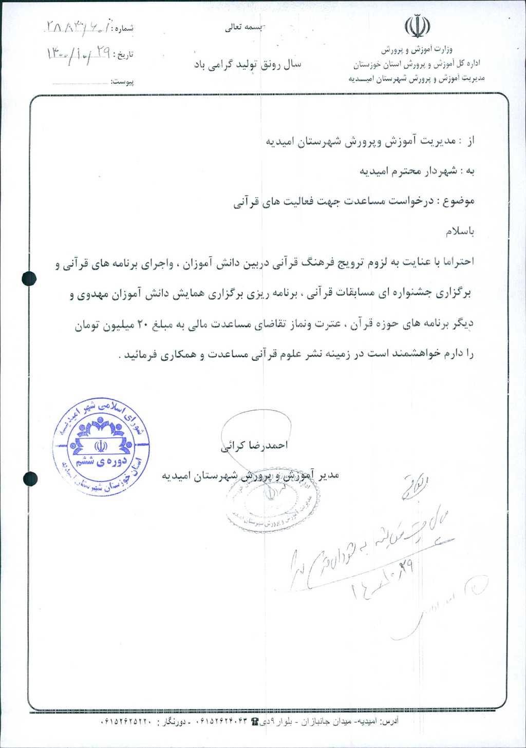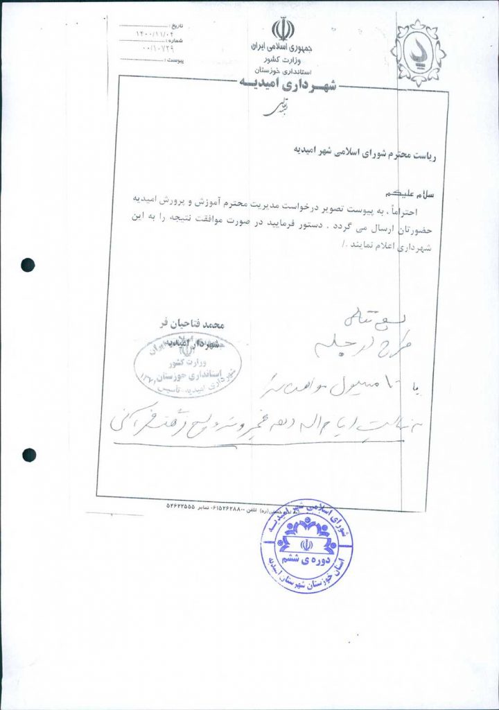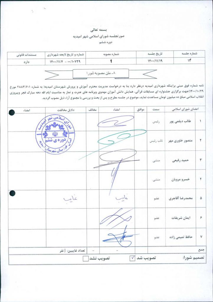 نامه شماره فوق مبنی براینکه شهرداری امیدیه درنظر دارد بنا به درخواست مدیریت محترم آموزش و پرورش شهرستان امیدیه( به شماره ۶۰۱/ ۲۸۸۳ مورخ ۲۹/ ۱۰/ ۱۴۰۰)جهت برگزاری جشنواره ای مسابقات قرآنی، همایش دانش آموزان مهدوی وبرنامه های عترت و نماز به مناسبت ایام الله دهه مبارک فجر وپیروزی انقلاب اسلامی مبلغ ده میلیون تومان مساعدت نماید، موضوع در جلسه مطرح و پس از بحث و بررسی با مجموع آراء ذیل مصوب گردید.