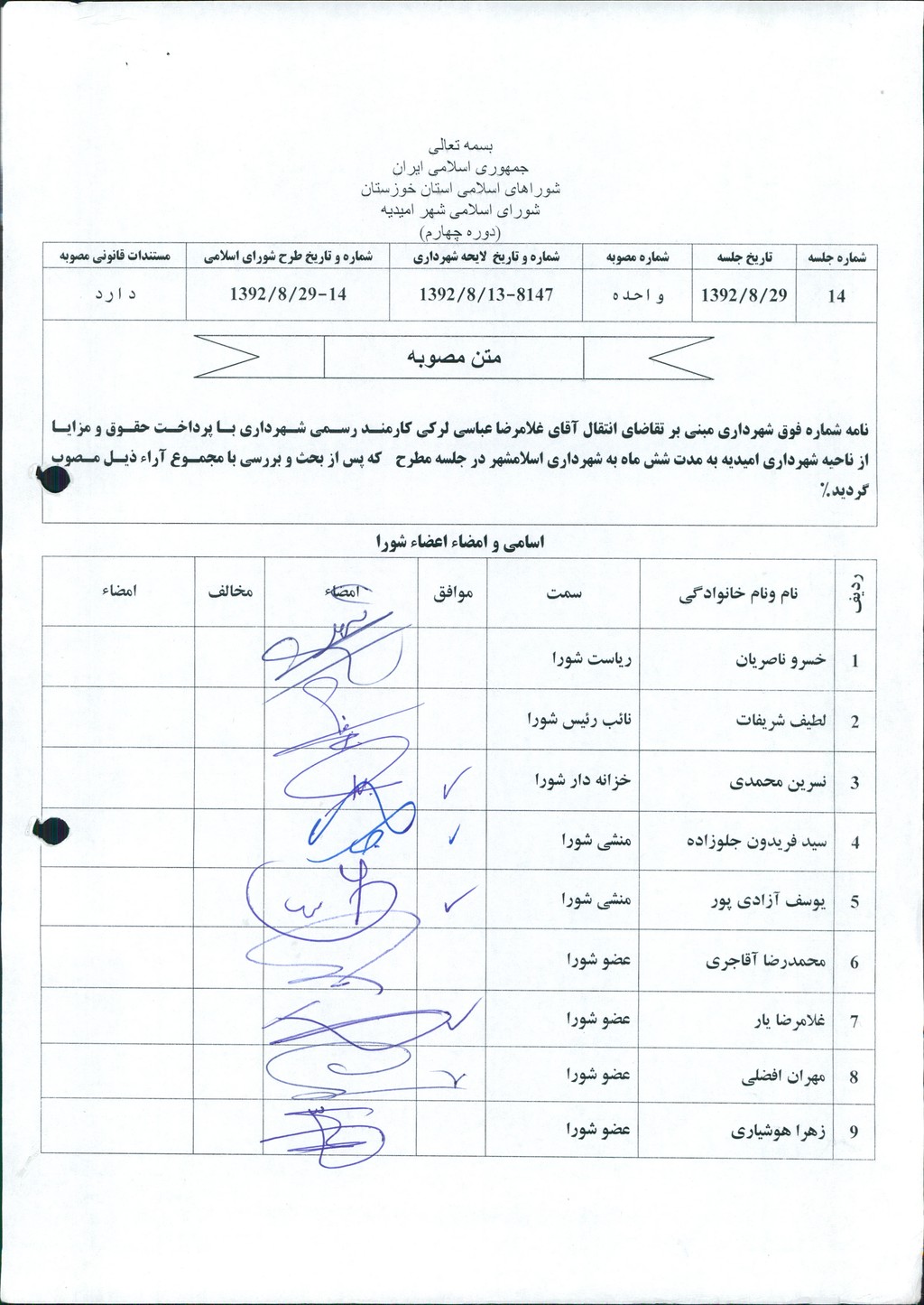 مصوبه شماره ۱ جلسه شماره ۱۴ شورای اسلامی شهر امیدیه
