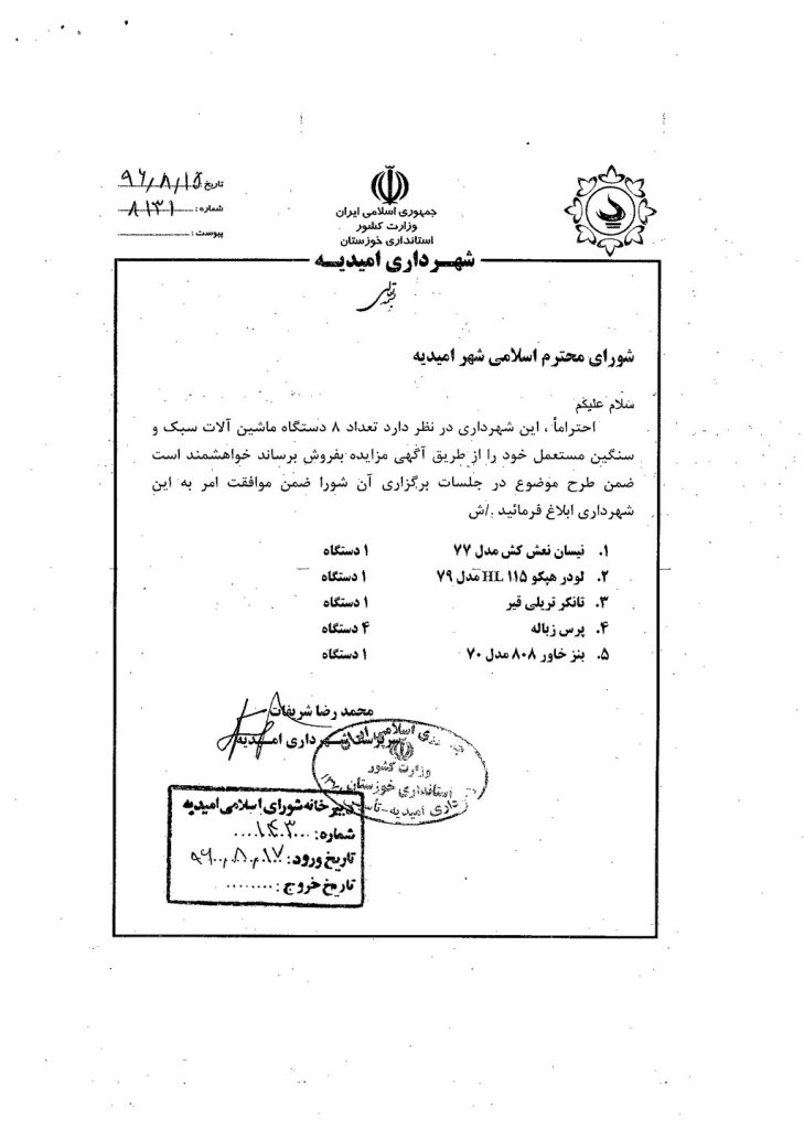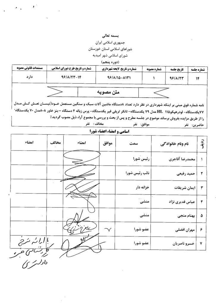 نامه شماره فوق مبنی بر اینکه شهرداری در نظر دارد تعداد ۸ دستگاه ماشین آلات سبک و سنگین مستعمل خود (نیسان نعش کش مدل ۷۷ یک دستگاه – لودرهپکو ۱۱۵HL مدل ۷۹ یک دستگاه – تانکر تریلی قیر یک دستگاه – پرس زباله ۴ دستگاه – بنز خاور ۸۰۸ مدل ۷۰ یک دستگاه) را از طریق مزایده بفروش برساند موضوع در جلسه مطرح و پس از بحث و بررسی با مجموع آراء ذیل مصوب گردید%
