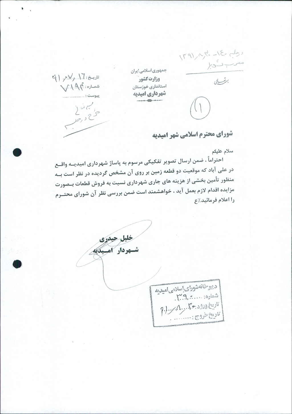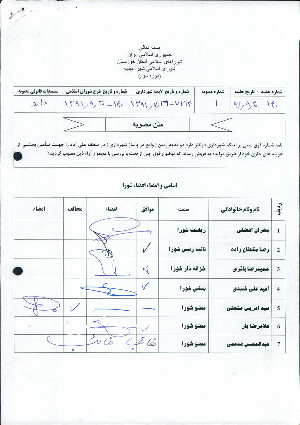مصوبه شماره ۱ جلسه شماره ۱۴۰ شورای اسلامی شهر امیدیه