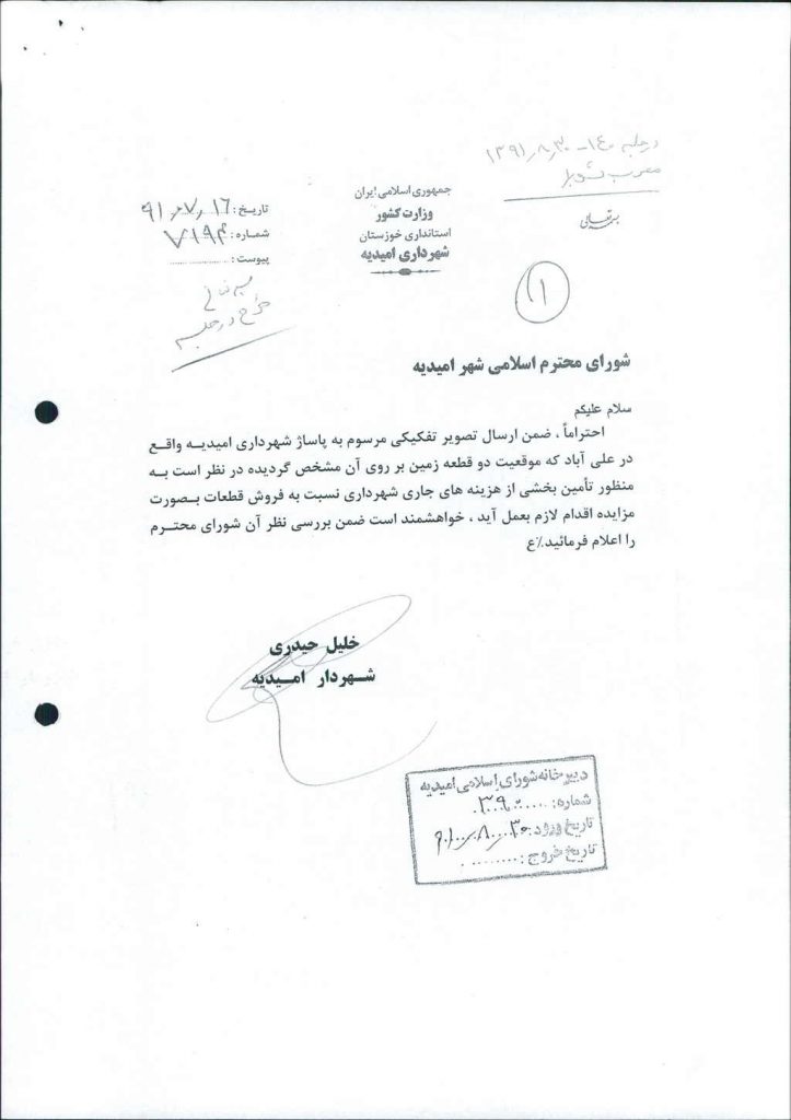 نامه شماره فوق مبنی بر اینکه شهرداری درنظر دارد دو قطعه زمین ( واقع در پاساژ شهرداری ) در منطقه علی آباد را جهت تأمین بخشی از هزینه های جاری خود از طریق مزایده به فروش رساند که موضوع فوق پس از بحث و بررسی با مجموع آراء ذیل مصوب گردید%