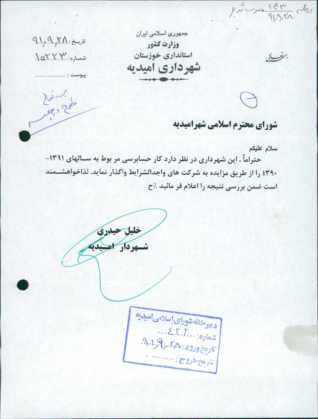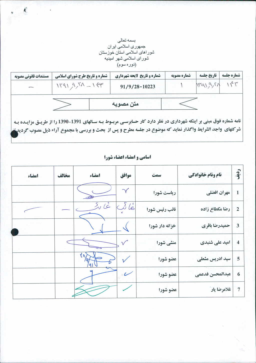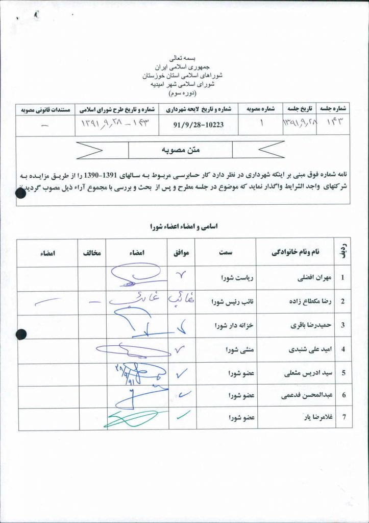 مصوبه شماره ۱ جلسه شماره ۱۴۳ مورخ ۹۱/۹/۲۸ شورای اسلامی شهر امیدیه