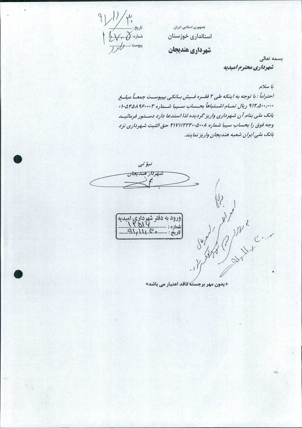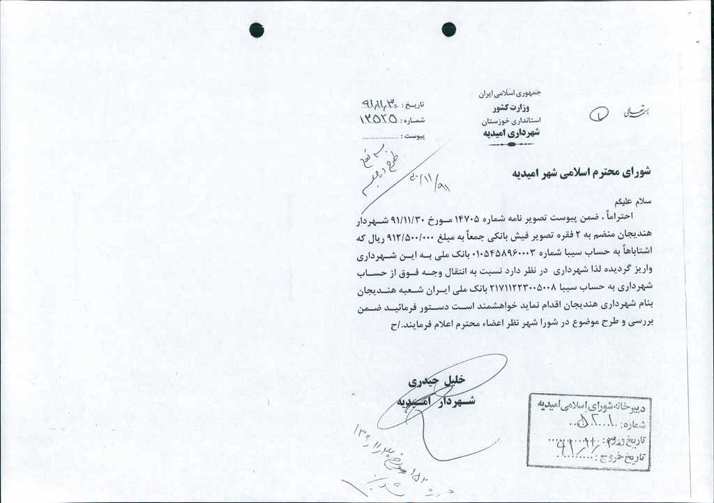 نامه شماره فوق شهرداری  در خصوص استرداد مبلغ -/۰۰۰/ ۵۰۰/ ۹۱۲ریال به حساب شهرداری هندیجان (حساب سیبا شماره ۲۱۷۱۱۲۲۳۰۰۵۰۰۸ بانک ملی)که اشتباهاً طی دو فقره چک به حساب سیبا شماره ۰۱۰۵۴۵۸۹۶۰۰۰۳ بانک ملی شهرداری امیدیه واریز گردیده با عنایت به درخواست شهردار هندیجان مطرح که پس از بحث و بررسی با مجموع آراء ذیل مصوب گردید%