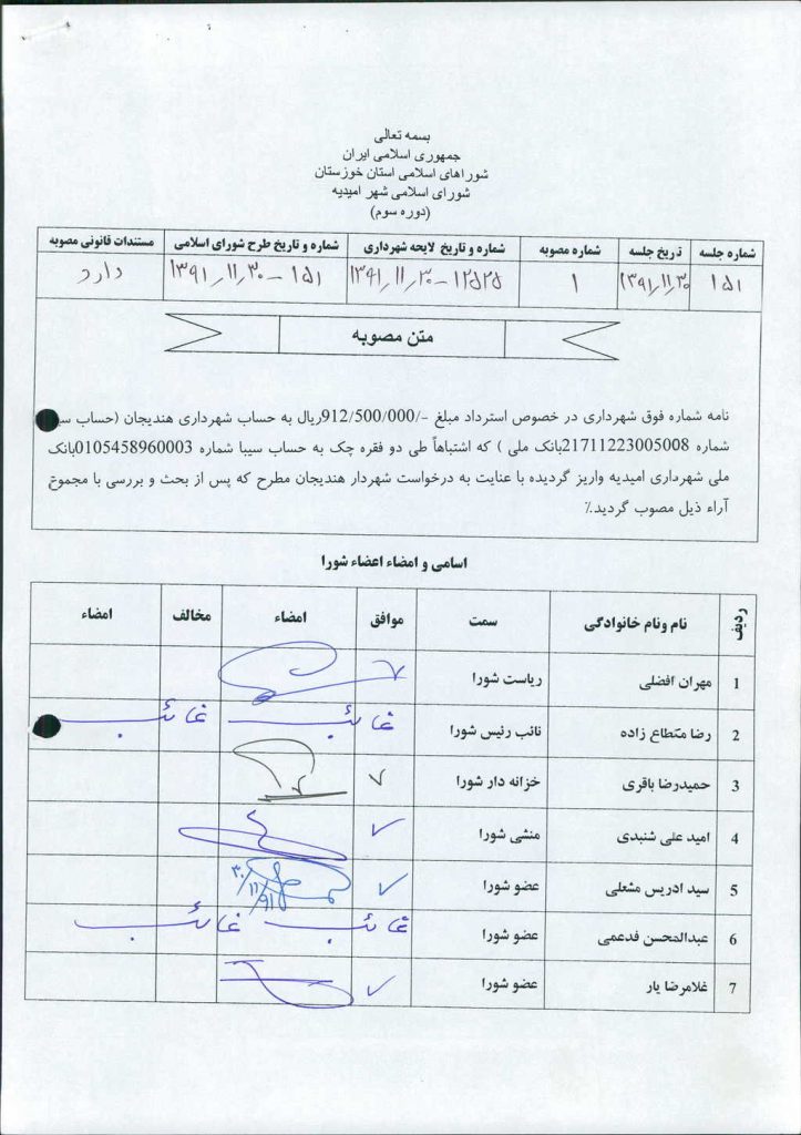 مصوبه شماره ۱ جلسه شماره ۱۵۱ مورخ ۹۱/۱۱/۳۰ شورای اسلامی شهر امیدیه